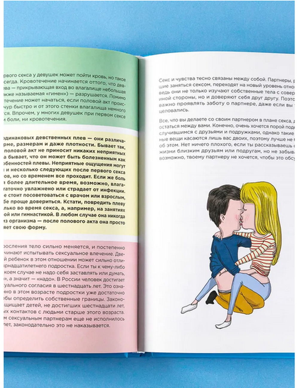 Что происходит с моим телом? Что такое любовь и как быть с кем-то в отношениях? Какие бывают поцелуи? Что такое секс и как заниматься им безопасно? Какие бывают ЗППП и как уберечься от них? Как протекает беременность и как реагировать на то, что кто-то усыновлен? Важное место уделено человеческой составляющей: что такое здоровые взаимоотношения, как распознать манипулирование, как сохранить приватность в соцсетях — и многому другому.