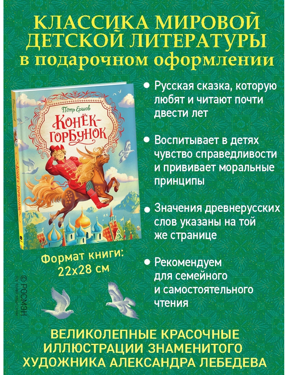 Подарочное издание непревзойдённой сказки Петра Ершова – золотой классики русской детской литературы. Благодаря юмору, иронии, метким наблюдениям и лёгкому поэтическому слогу, историей зачитываются многие поколения детей, а приключения доброго простодушного Иванушки и его чудо-конька остаются в числе самых любимых. Не богатырь, не писаный красавец и не наследник трона, а простой крестьянский сын Иван вместе со своим другом и товарищем коньком-горбунком поступает на службу в царские конюшни. С этого и начинаются все самое удивительное! А на великолепных красочных иллюстрациях известного российского художника Александра Лебедева герои словно оживают. Книга расскажет, как с помощью смекалки и доброго сердца избежать опасностей и исполнить заветное желание, познакомит со старыми русскими традициями и привьет любовь к чтению. Произведение входит в школьную программу для начальных классов и подойдет как для семейного досуга, так и для самостоятельного чтения.