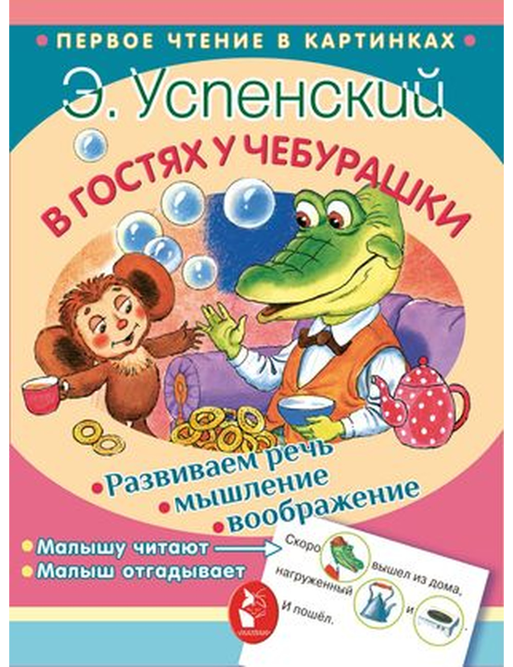 Э. Успенский придумал всемирно известных героев - неизвестного науке зверька Чебурашку и его лучшего друга крокодила Гену. И написал про них много сказок. .Прочитайте малышу сказки "В гостях у Чебурашки" и "Чебурашка и Змейчик" и попросите его назвать вслух те слова, которые заменены картинками. .Детки с удовольствием познакомятся с этими знаменитыми друзьями, рассмотрят большие картинки, а заодно увеличат свой словарный запас, смогут научиться правильно излагать свои мысли и потренируют воображение!