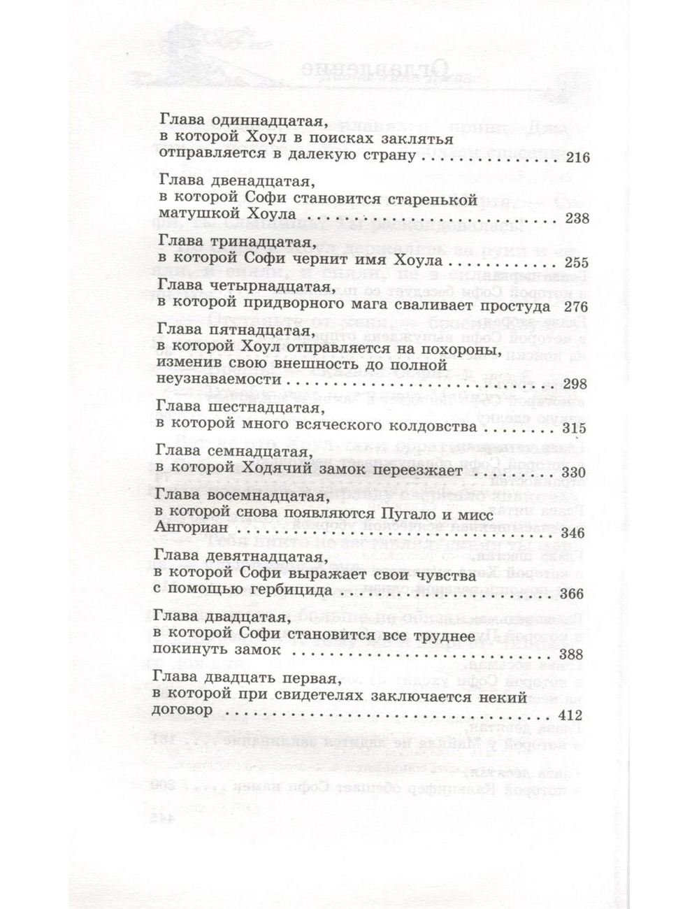 ...Софи живет в сказочной стране, где ведьмы и русалки, семимильные сапоги и говорящие собаки — обычное дело. Поэтому, когда на нее обрушивается ужасное проклятие коварной Болотной Ведьмы, Софи ничего не остается, как обратиться за помощью к таинственному чародею Хоулу, обитающему в Ходячем замке. Однако, чтобы освободиться от чар, Софи предстоит разгадать немало загадок и прожить в замке у Хоула гораздо дольше, чем она рассчитывала. А для этого нужно подружиться с огненным демоном, поймать падающую звезду, подслушать пение русалок, отыскать мандрагору и многое, многое другое.
