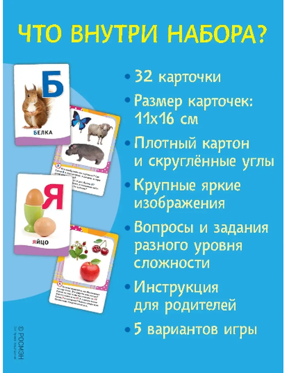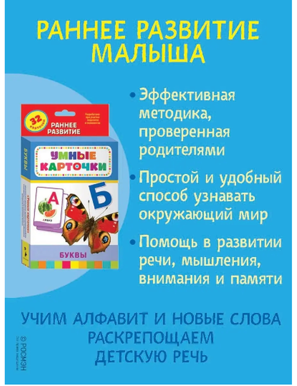 Эффективный помощник родителей во всестороннем гармоничном развитии малыша. Развивающие карточки в игровой форме помогут в формировании навыков внимания, мышления, речи и памяти ребенка. Набор "Развивающие карточки": 32 карточки размером 11x16 см, плотный картон, скруглённые углы; крупное красочное изображение предмета и его название; вопросы-подсказки разного уровня сложности и инструкции для родителей; эффективный и проверенный способ вовлечь малыша в коммуникацию; 4 варианта игры. С набором можно заниматься неоднократно. Предложенные упражнения можно усложнять, а также придумать собственные игры. Набор входит в серию-бестселлер "Умные карточки 0+" и рассчитан на короткие занятия, чтобы ребенок не устал. Серия обеспечит комплексный подход к раннему развитию малыша, это простой и удобный способ познавать окружающий мир, тренировать важные коммуникативные навыки.