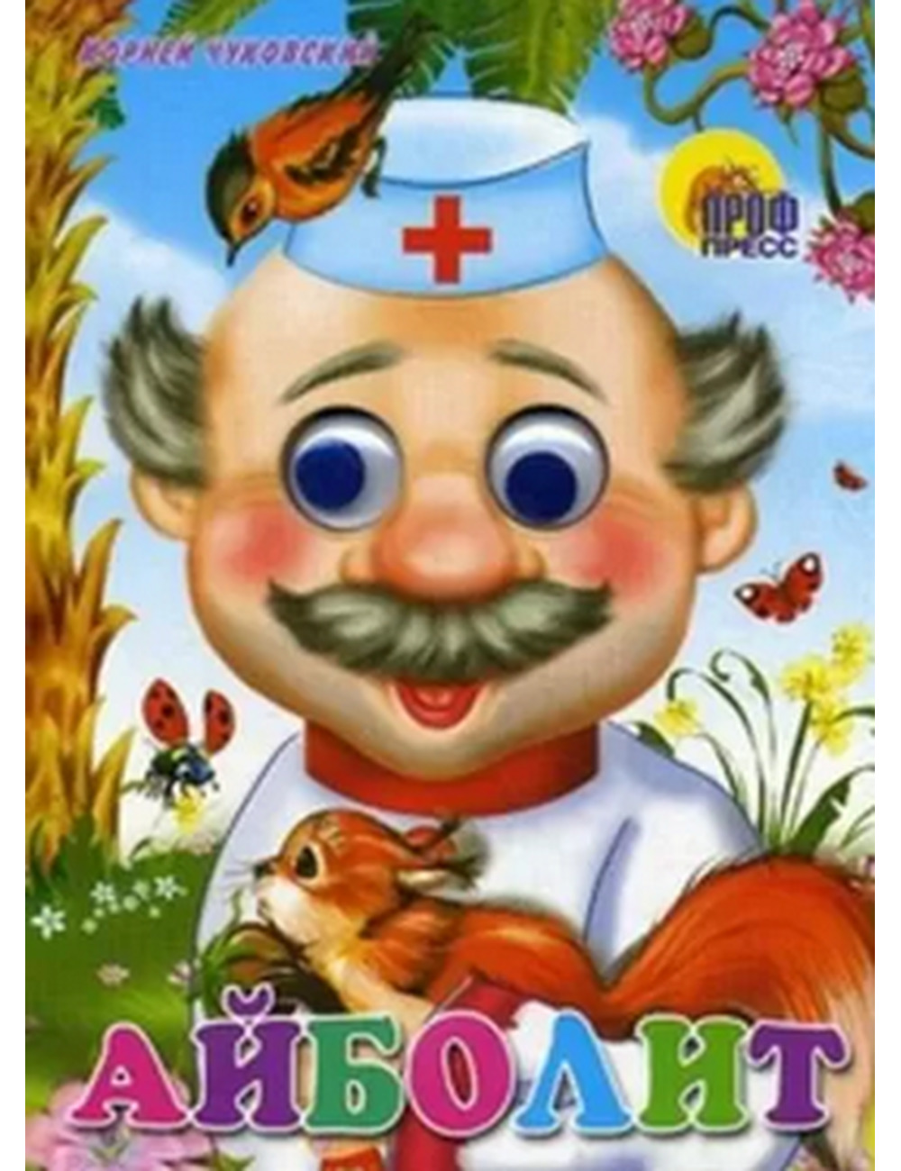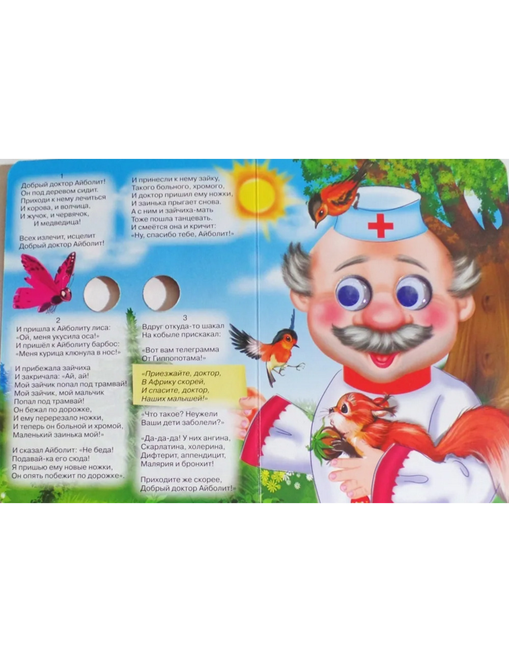 Картонные страницы. На каждой странице у сказочного героя на месте глаз - прорези. На последней странице - пластиковые глазки с подвижными цветными зрачками. Ребенок переворачивает страницы, и у героя "появляются " глазки.