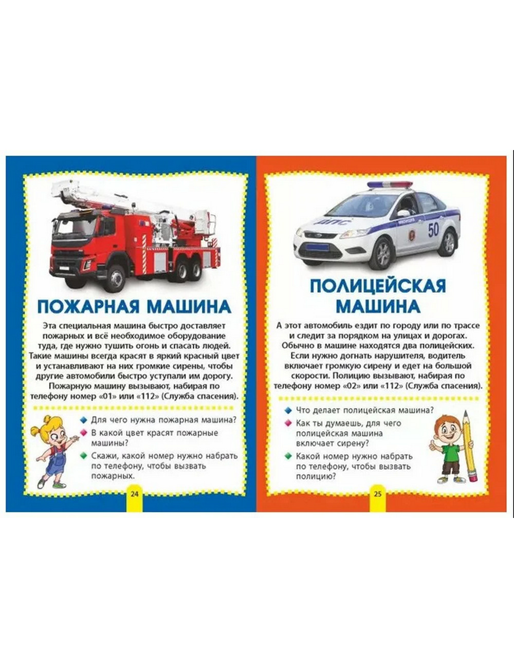 В книге «Машины» дети смогут познакомиться с самыми разными автомобилями и транспортом: внедорожником и самосвалом, кабриолетом и болидом, автовозом и фурой, трамваем и троллейбусом, а также узнают, чем, например, отличается седан от пикапа или автокран от бульдозера.
