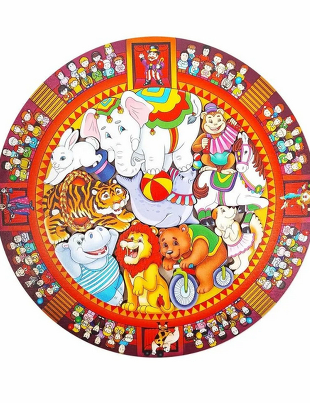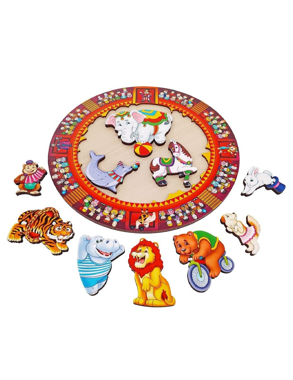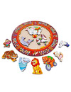 В наборе от 10 фигурок животных, которые нужно расположить на поле. На входящем в набор вкладыше приведена картинка укладки фигурок. Достаньте элементы из рамки и разложите их на столе. Предложите малышу собрать пазл сначала по образцу, а потом по памяти. Это не так просто, как кажется на первый взгляд. В ходе игры можно поговорить с ребенком о животных, как они называются, как называют их детенышей, чем они питаются, как помогают человеку...