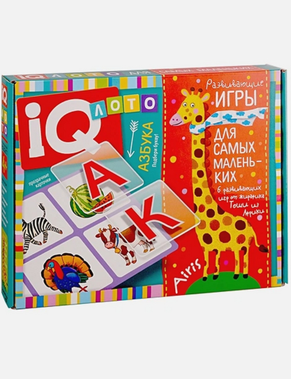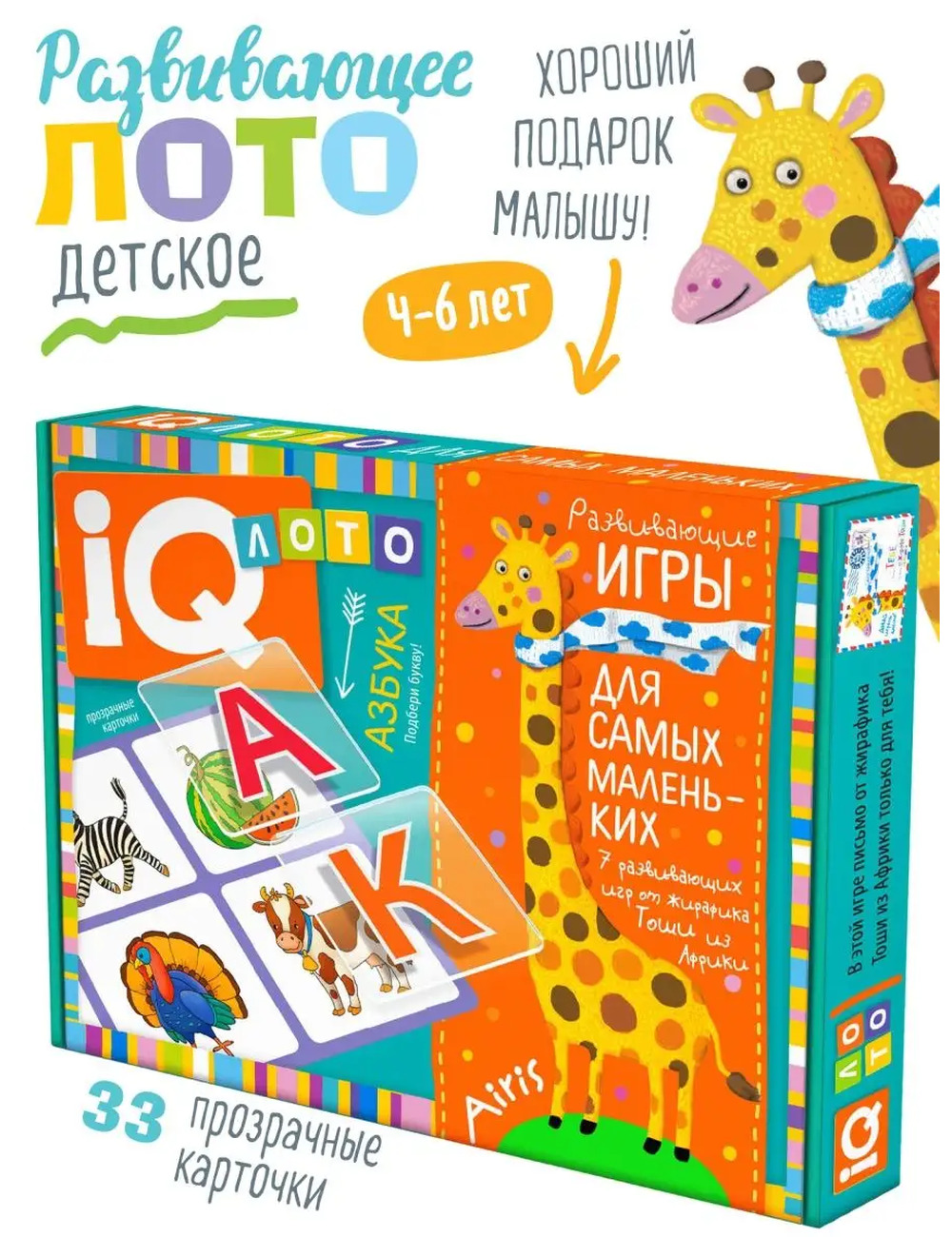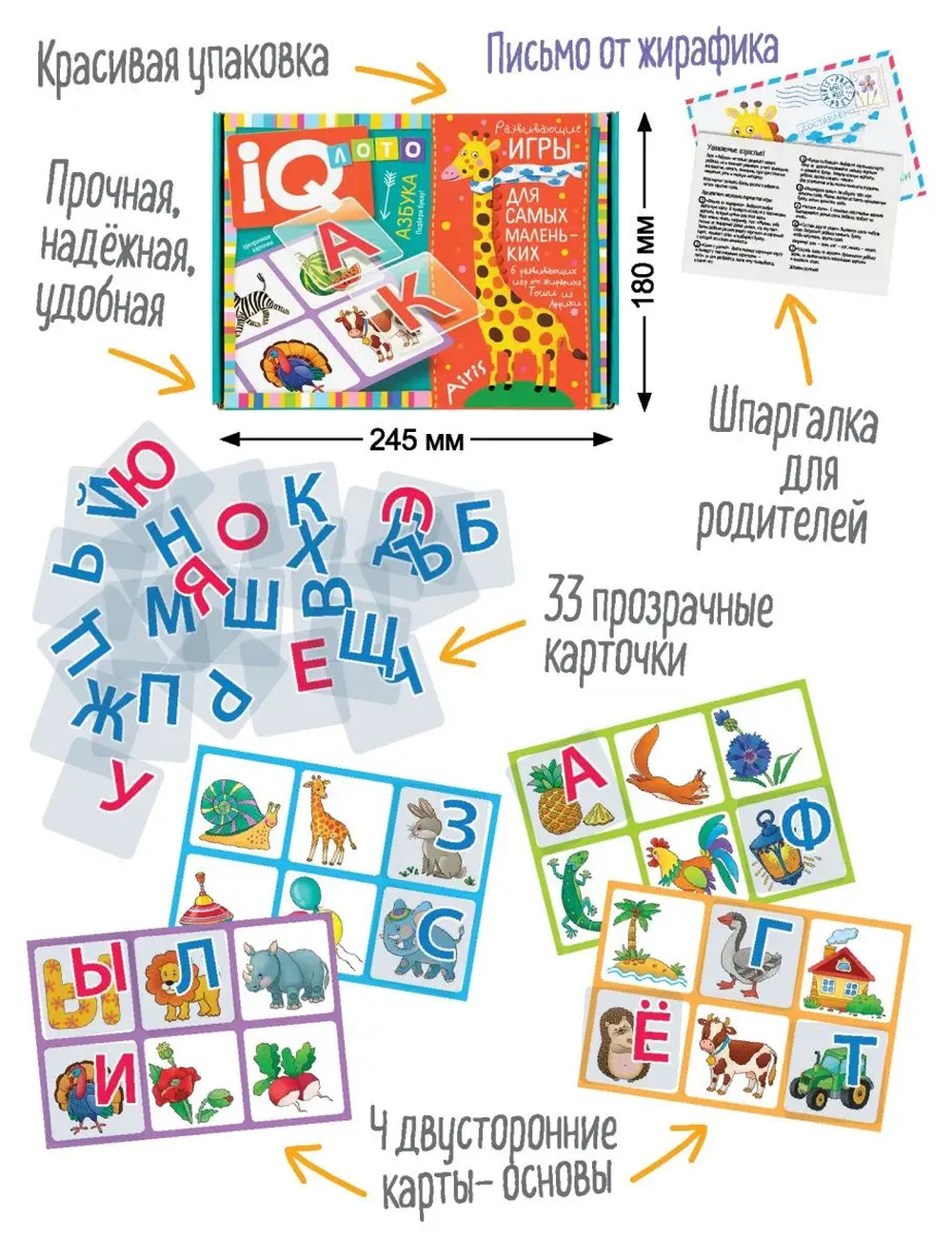 Лото разработано с учётом возрастных особенностей малышей. С помощью этого набора ребёнок познакомится с буквами и попробует прочитать первые слова. Лото научит обобщать и анализировать, заложит основы структурного мышления. Основной принцип игры - "Подбери букву". Лото поможет в развитии зрительного восприятия, внимания и пространственного мышления. Прозрачные карточки позволят ребёнку самому экспериментировать и проверять правильность решения. В наборе 4 картонные карты, 33 прозрачных карточки и конверт, в котором ребёнок найдёт письмо от жирафа Тоши, а взрослые - инструкцию.