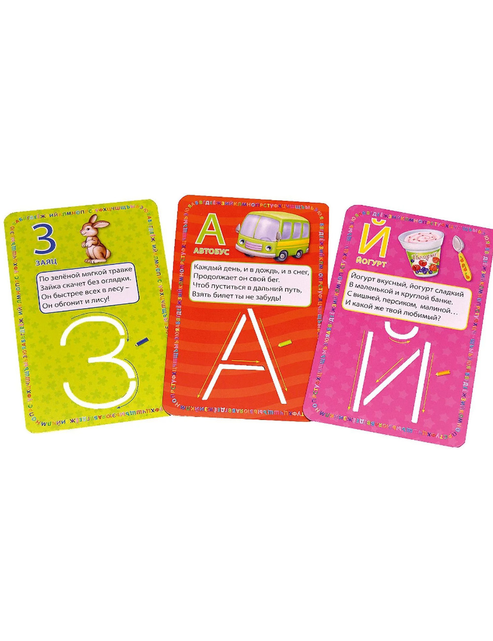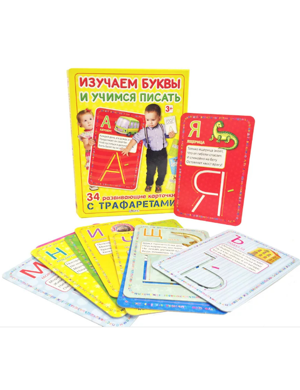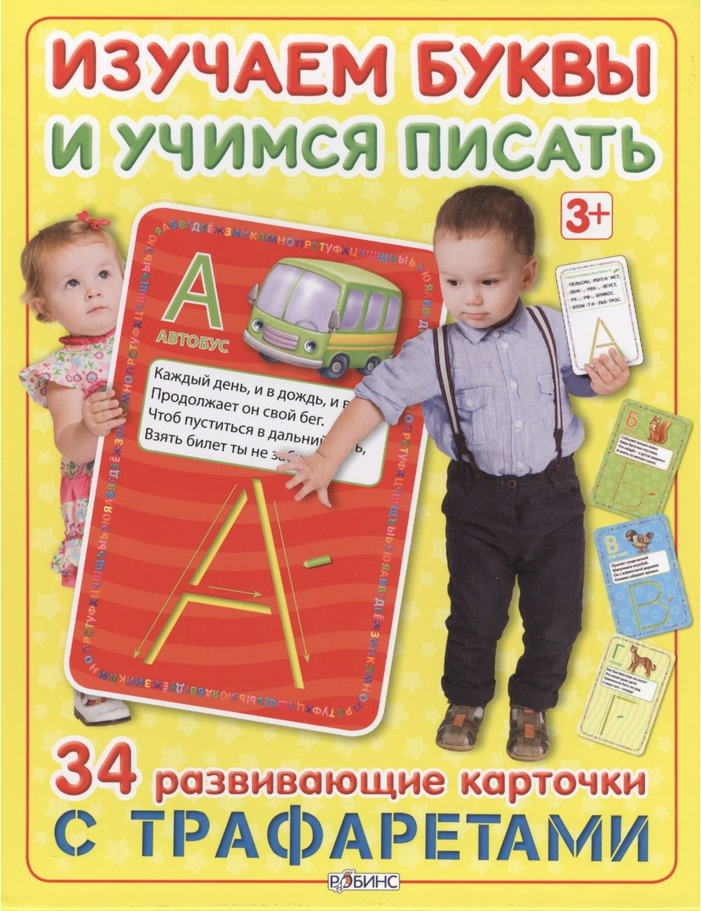 «Изучаем буквы и учимся писать с трафаретами» - комплект, состоящий из 34 обучающих карточек - по одной на каждую букву алфавита. С лицевой стороны карточки вы найдёте трафарет, изображение на конкретную букву и стихотворение к ней, а на обратной стороне - игровое задание с прописями для тренировки навыков письма. Комплект предназначен для детей в возрасте от 3 лет. Ребёнок легко запомнит все буквы алфавита, научится писать их, пополнит свой словарный запас новыми словами и понятиями, позанимается с трафаретами, развивая мелкую моторику, память, внимание и воображение, тренируя навыки чтения и письма.