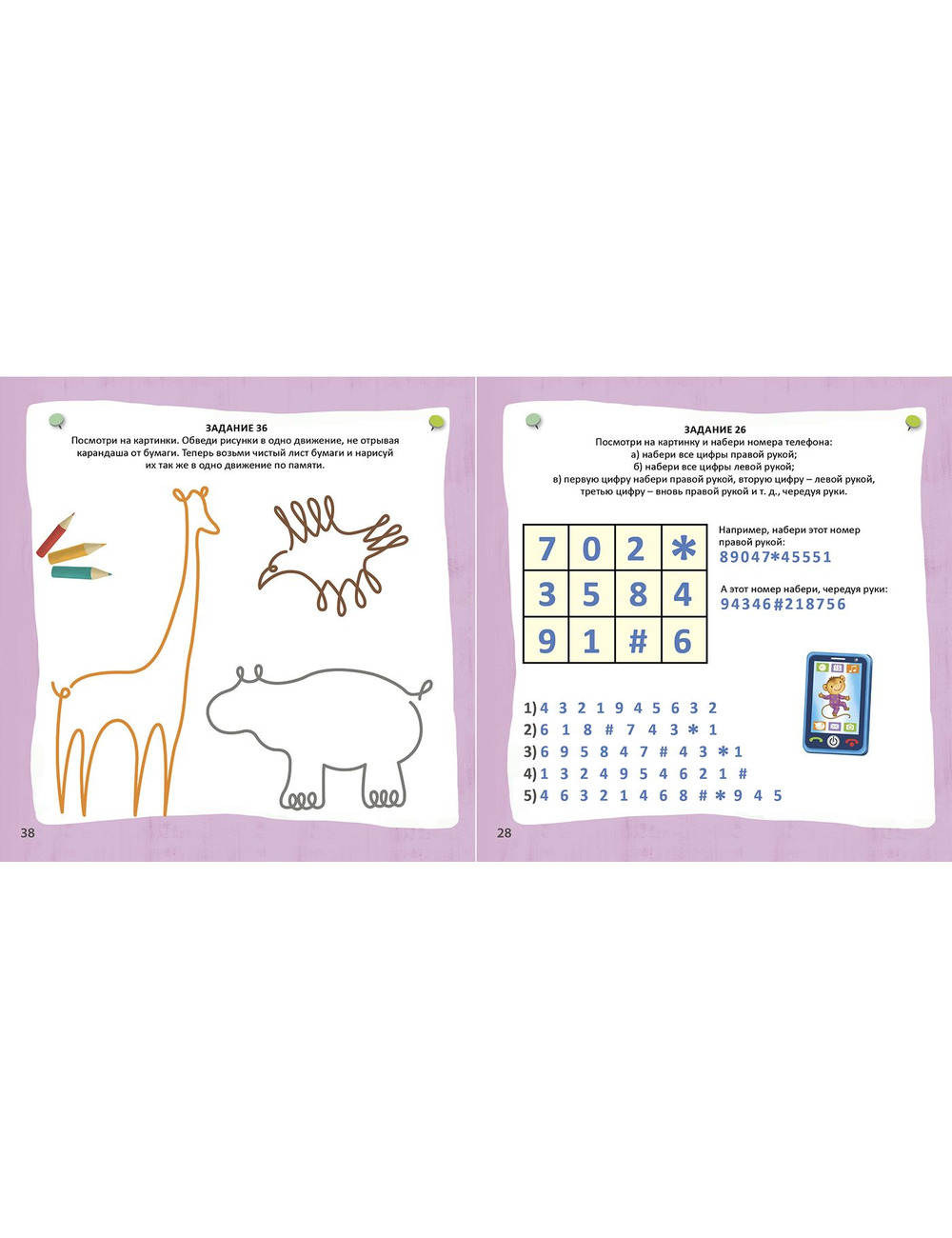 Пособие направлено на стимулирование работы правого и левого полушарий мозга. Задания совмещают моторные и сенсорные функции: речь и чувство ритма, речь и восприятие трехмерного пространства, чувство ритма и операции с последовательностями, действия с цифрами и восприятие цвета, движение и чтение и другие.
