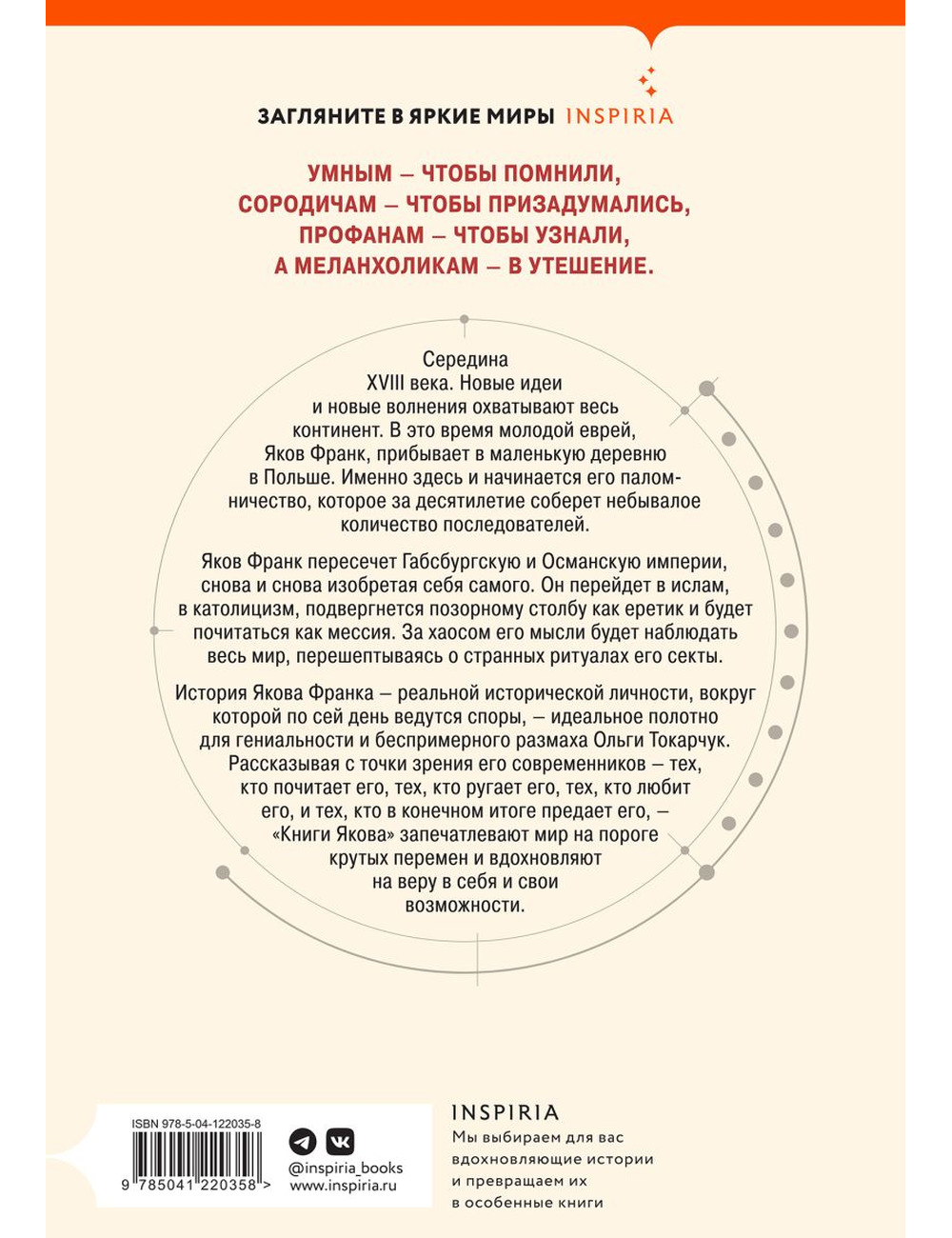 История Якова Франка — реальной исторической личности, вокруг которой по сей день ведутся споры, — идеальное полотно для гениальности и беспримерного размаха Ольги Токарчук. Рассказывая с точки зрения его современников — тех, кто почитает его, тех, кто ругает его, тех, кто любит его, и тех, кто в конечном итоге предает его, — «Книги Якова» запечатлевают мир на пороге крутых перемен и вдохновляют на веру в себя и свои возможности.