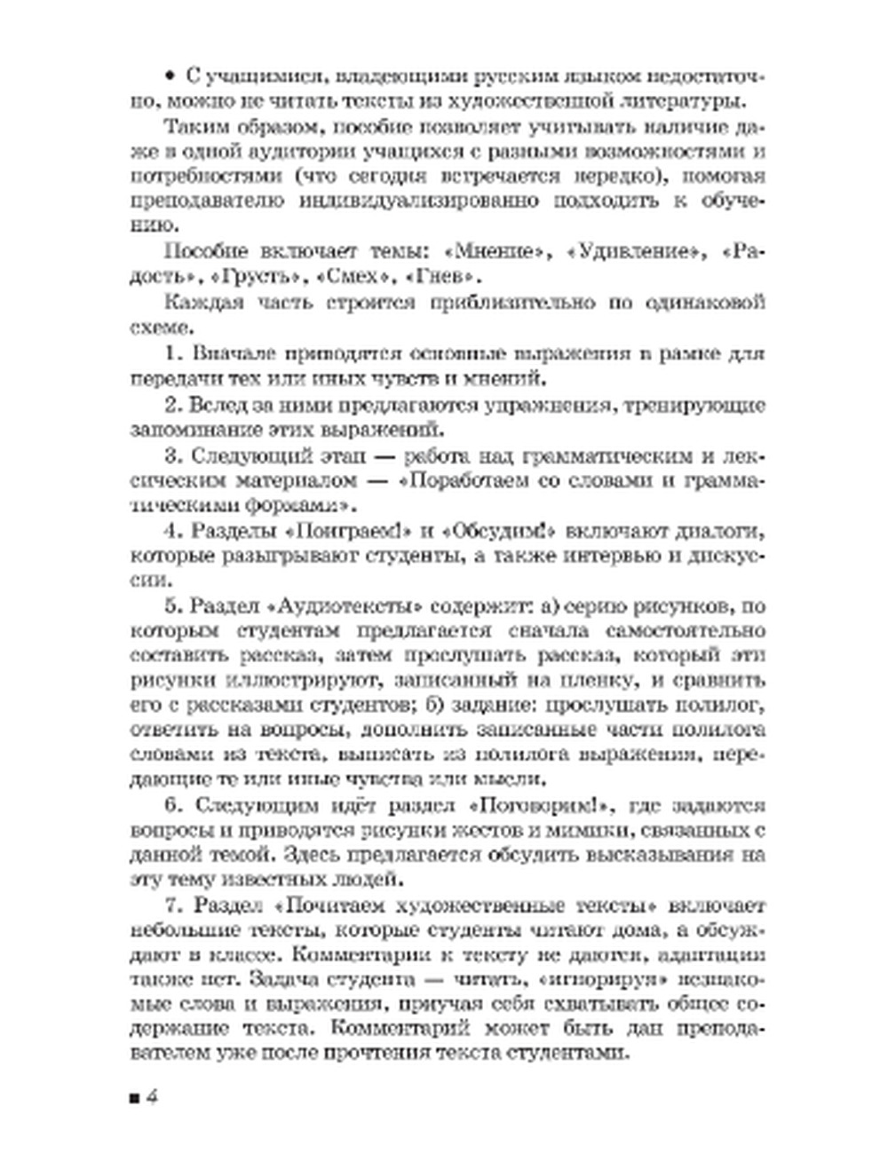 Цель пособия — формирование навыков и умений устной диалогической и монологической речи. Активизации устной речи способствуют творческие задания и использование разнообразных речевых конструкций в разных типах и стилях речи. Пособие состоит из 6 разделов («Мнение», «Удивление», «Любовь», «Ненависть», «Смех», «Гнев»), каждый из которых посвящен одной теме.