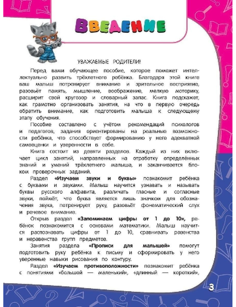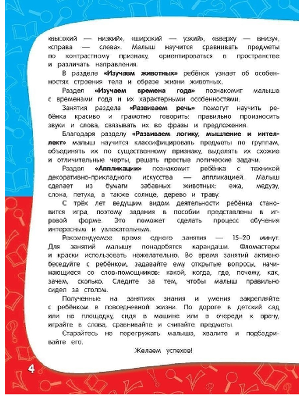 Теперь родителям не нужно покупать множество развивающих и обучающих пособий, задумываться о том, что же должен знать ребенок в этом возрасте, чему и как его нужно учить. Все необходимое для развития и обучения ребенка 3-4 лет собрано в этой книге! Путешествие по ее страницам превратит обучение ребенка в захватывающую интересную игру. Выполняя занимательные упражнения, ребенок быстро выучит буквы, разовьет речь, логику, интеллект, подготовит руку к письму, научится распознавать цифры и сопоставлять их с предметами, а также сможет сделать забавные аппликации и маску своими руками. Пособие соответствует новому Федеральному государственному образовательному стандарту дошкольного образования. При разработке курса авторы учли особенности современных детей, их потребности и психологию, опираясь на последние достижения педагогики и возрастной физиологии.