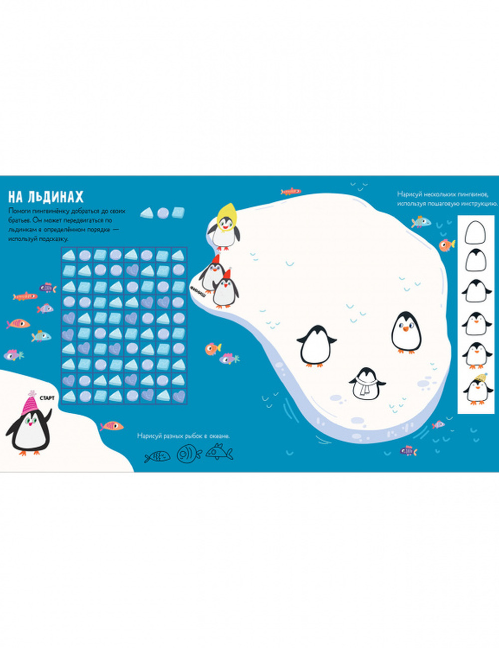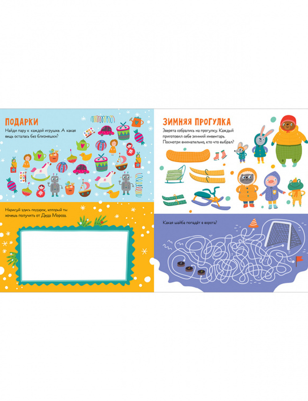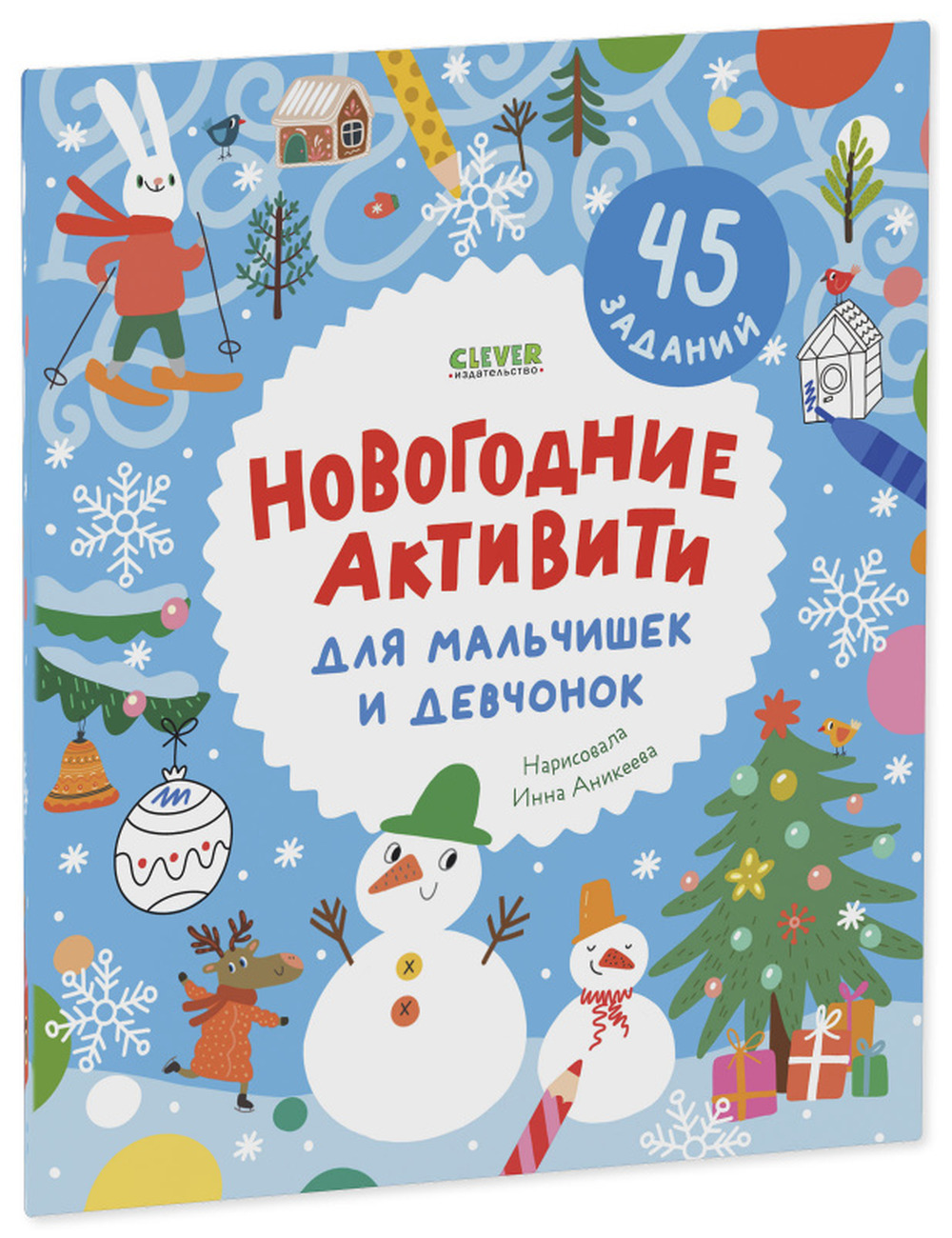 «Новогодние активити для мальчишек и девчонок» — это 45 разнообразных заданий для маленьких непосед: найти двух одинаковых мышат на праздничном утреннике, дорисовать шарфы и шапки снеговикам, раскрасить сценку в зимнем парке, помочь коту добраться до елки по лабиринту из мишуры и многое другое.