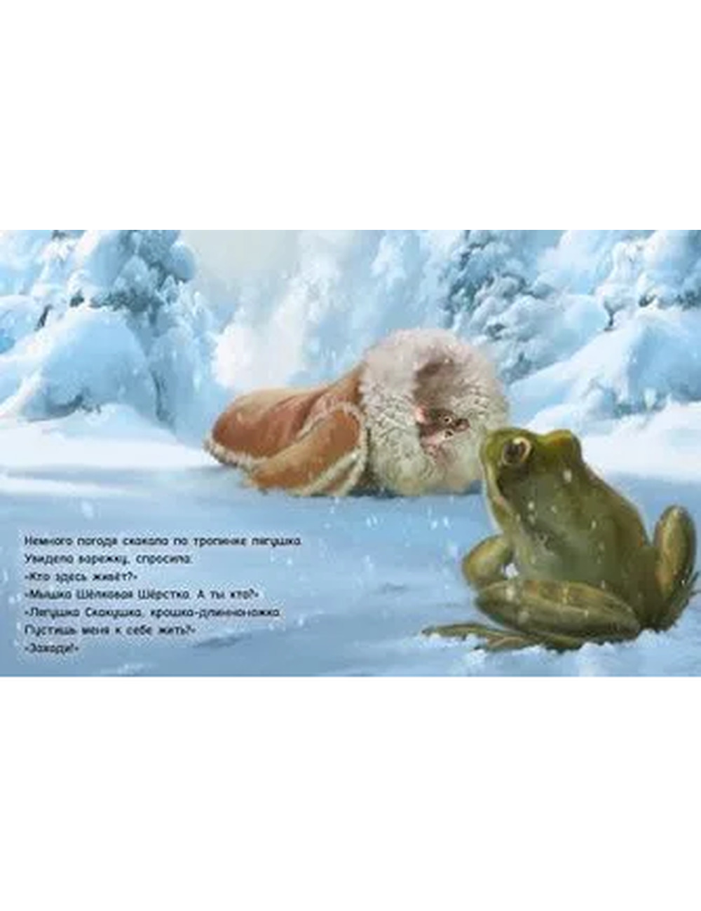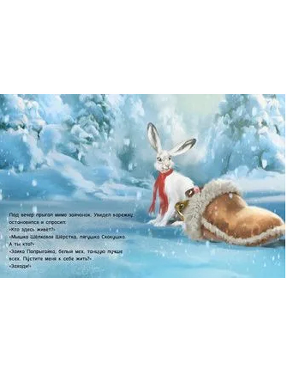 Теперь в ней живут Мышка Шёлковая Шёрстка, лягушка Скакушка, зайка Попрыгайка, лисица Пушица, волк Зубощёлк, Клыкан - дикий кабан и Косолапый - мишка мохнатый. Норвежский классик Альф Прёйсен пересказал сюжет народной сказки, а художник Асбьерн Тённесен создал уютные зимние иллюстрации.