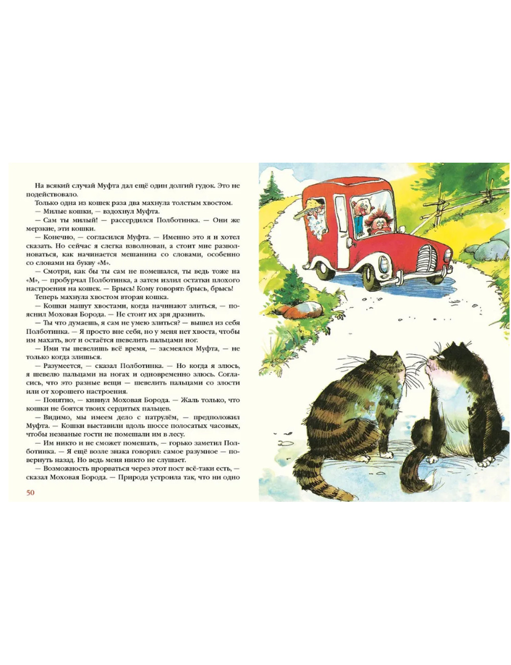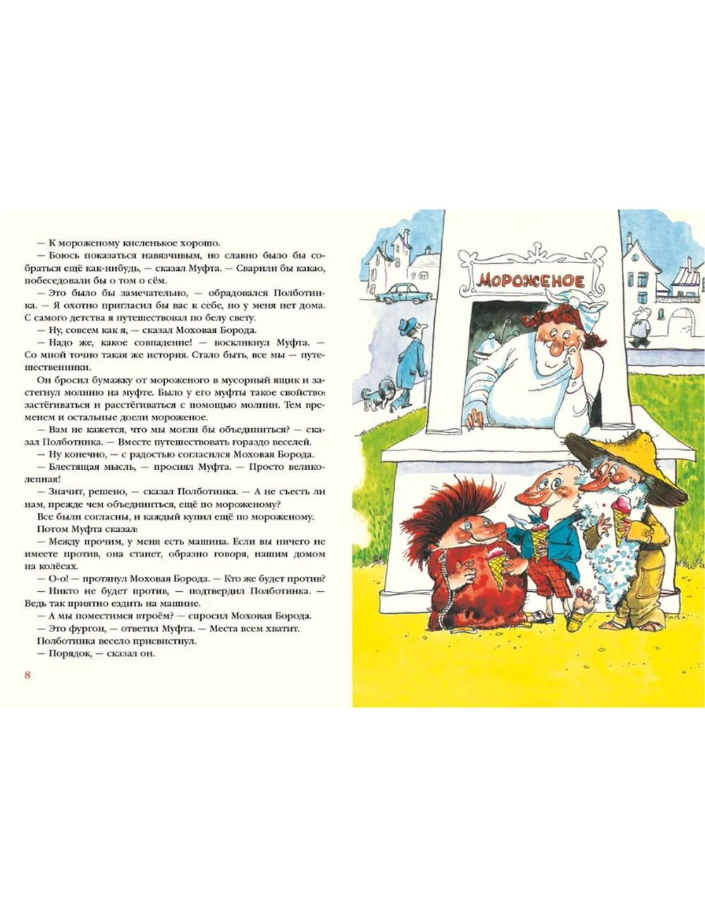 Героями этой сказки являются три маленьких, очень обаятельных и забавных накситралля, похожие на гномов. Муфта и зимой и летом носит вместо обычной одежды толстую муфту на молнии, Полботинка обут в ботинки с обрезанными носами, а у Моховой Бороды растёт борода из самого настоящего мха. Однажды они встретились у киоска с мороженым и после этой встречи уже не расставались, а стали путешествовать вместе. Весёлых друзей ждут невероятные приключения и неожиданные ситуации. Им придётся спасать город от коварных кошек и котов, помогать раненой гадюке, освобождать Моховую Бороду из рук предприимчивой дамы и даже застрять в фургоне между деревьями? Но дружба преодолевает все преграды! Ведь никогда нельзя терять надежду и веру в себя, даже если ты не такой, как все. Очаровательные иллюстрации известного художника Эдгара Вальтера обязательно найдут ключик к детскому сердцу и позволят ребятам поверить, что накситралли есть на самом деле.