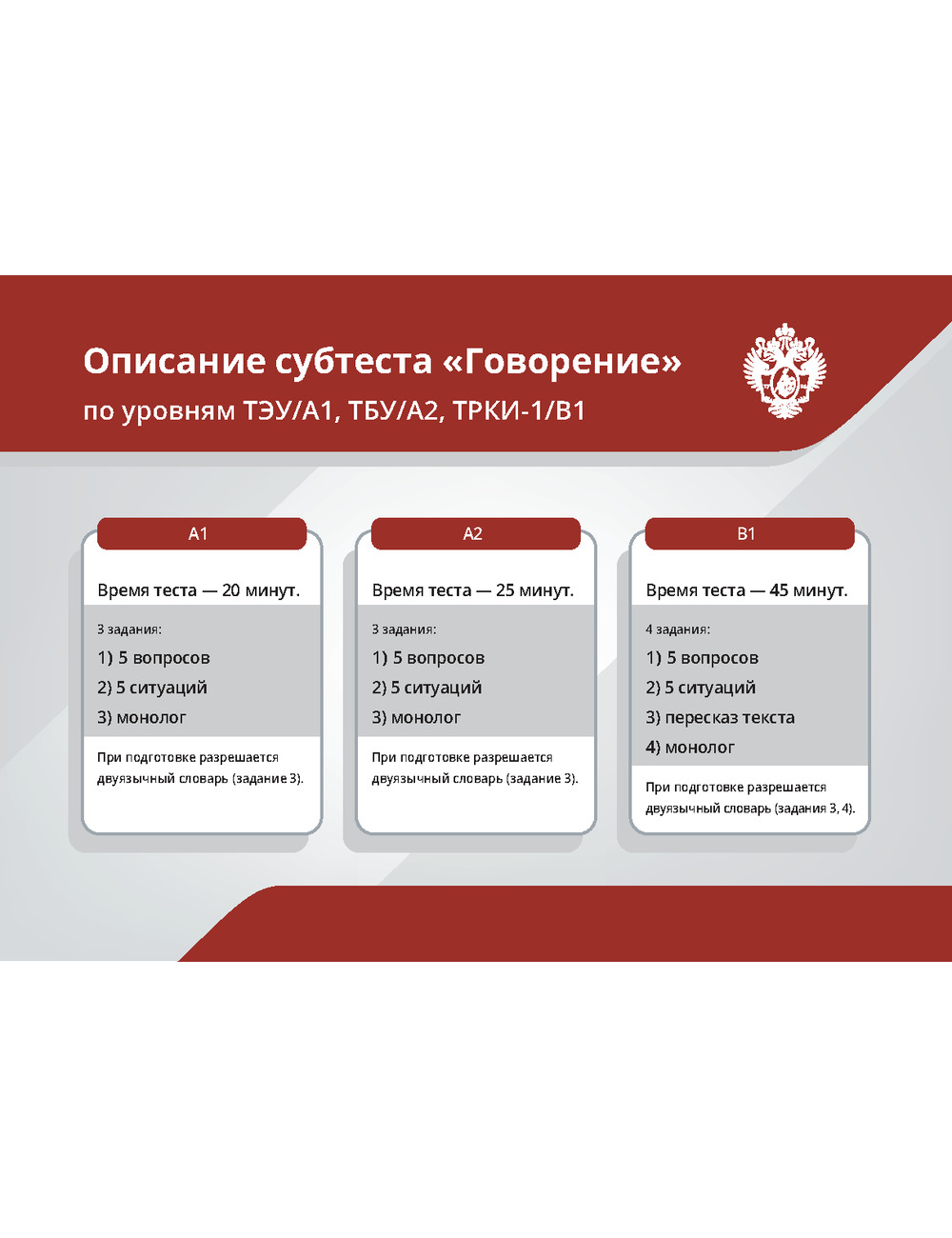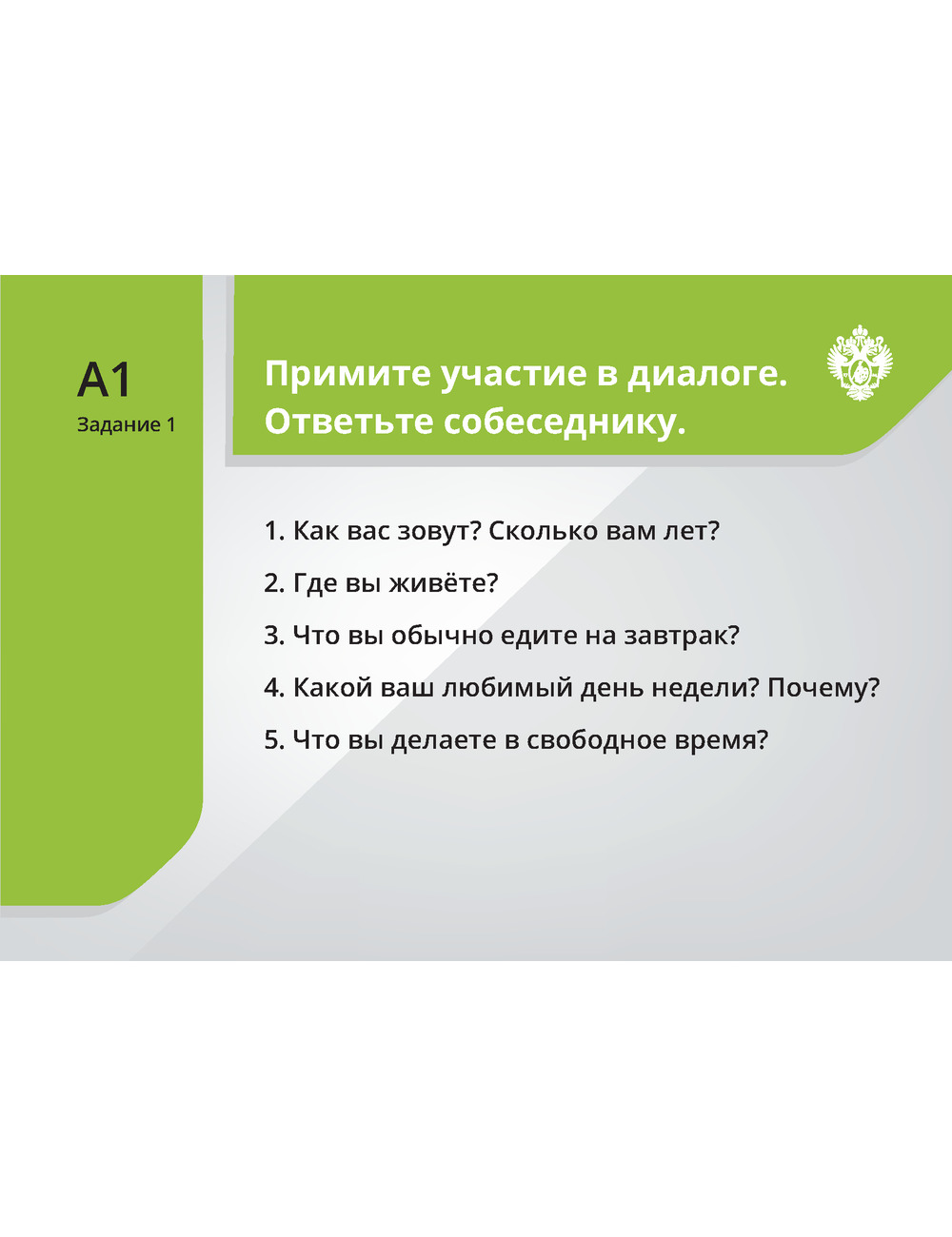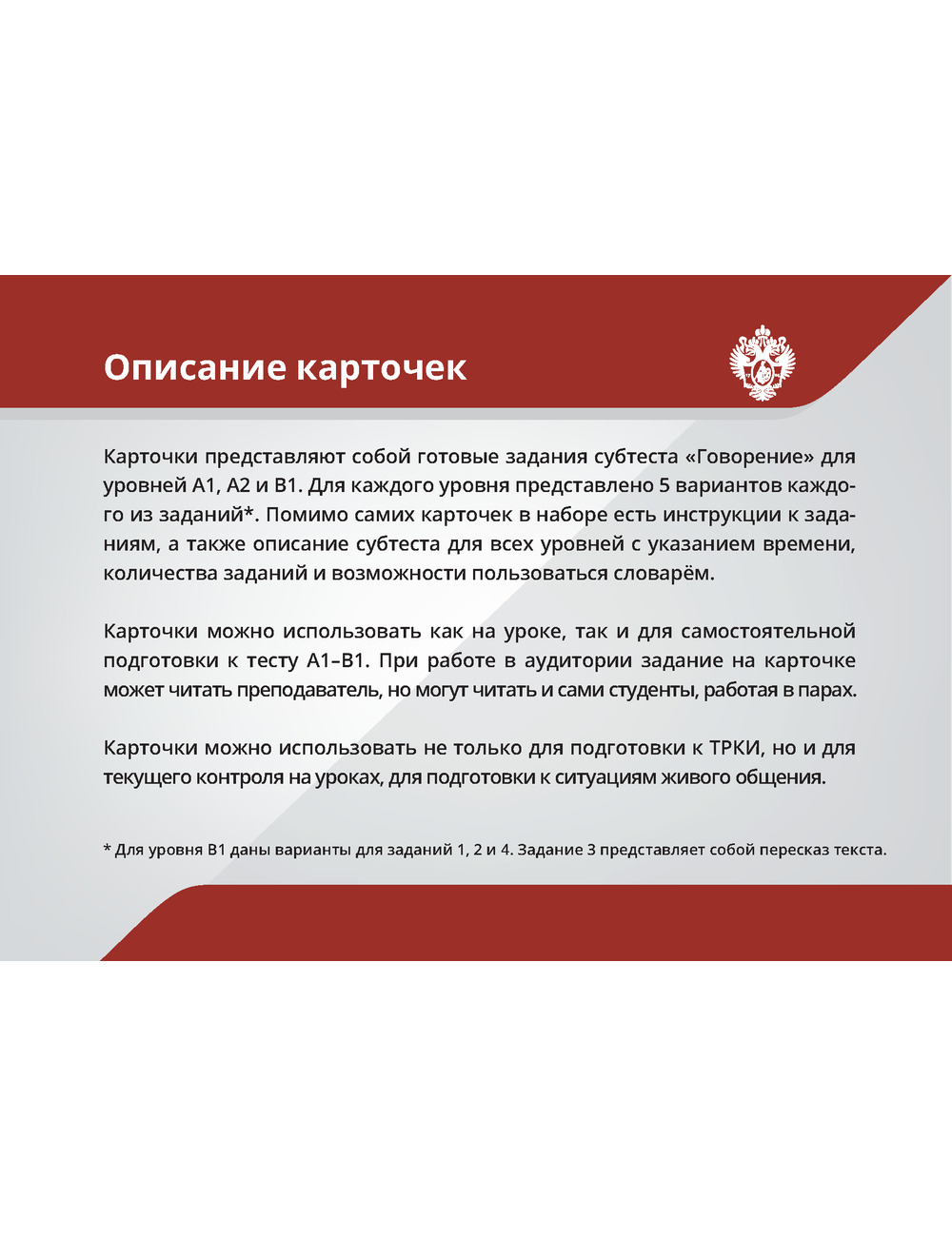 Карточки представляют собой готовые задания субтеста «Говорение» для уровней А1, А2 и В1. Для каждого уровня представлено 5 вариантов каждого из заданий*. Помимо самих карточек в наборе есть инструкции к заданиям, а также описание субтеста для всех уровней с указанием времени, количества заданий и возможности пользоваться словарём.