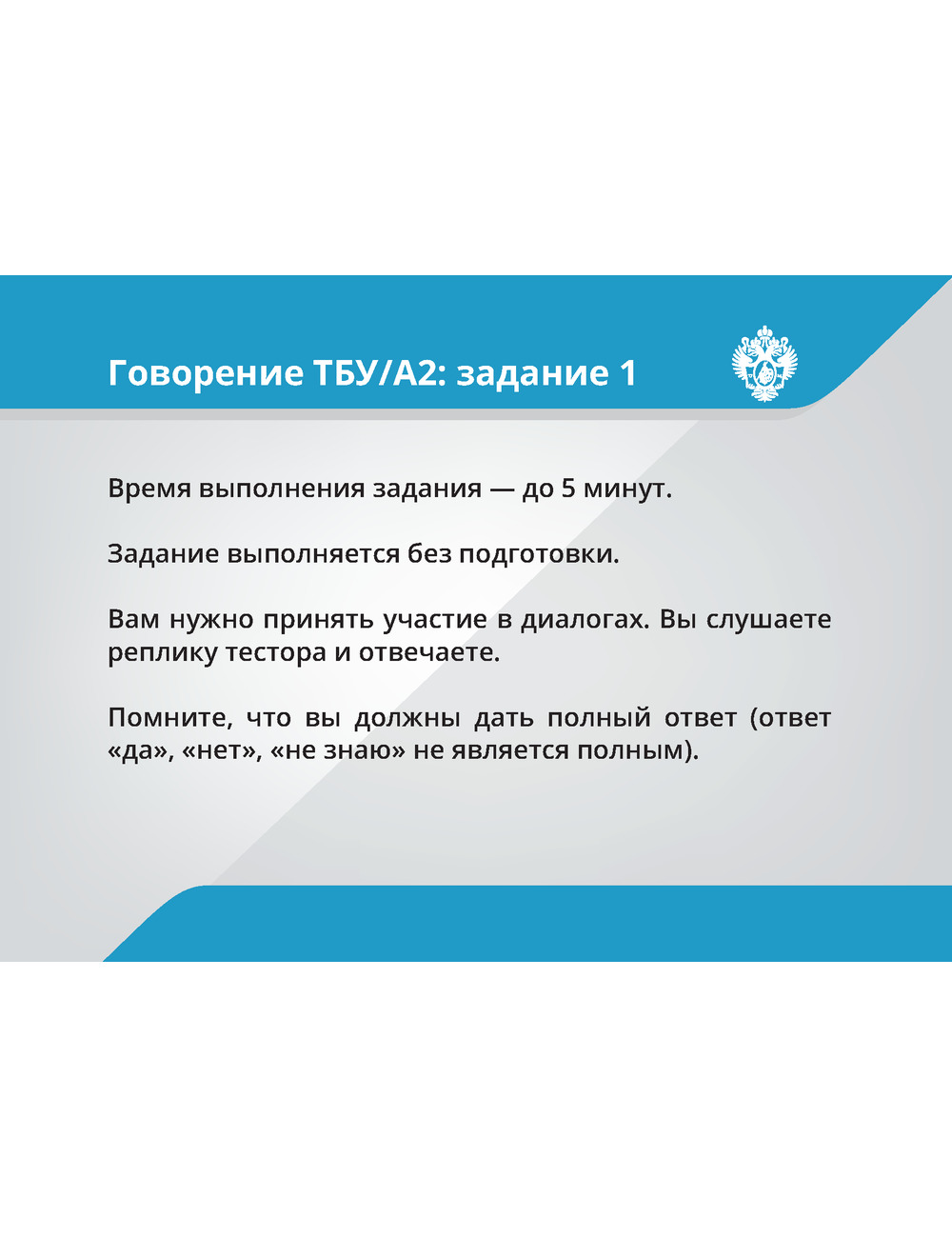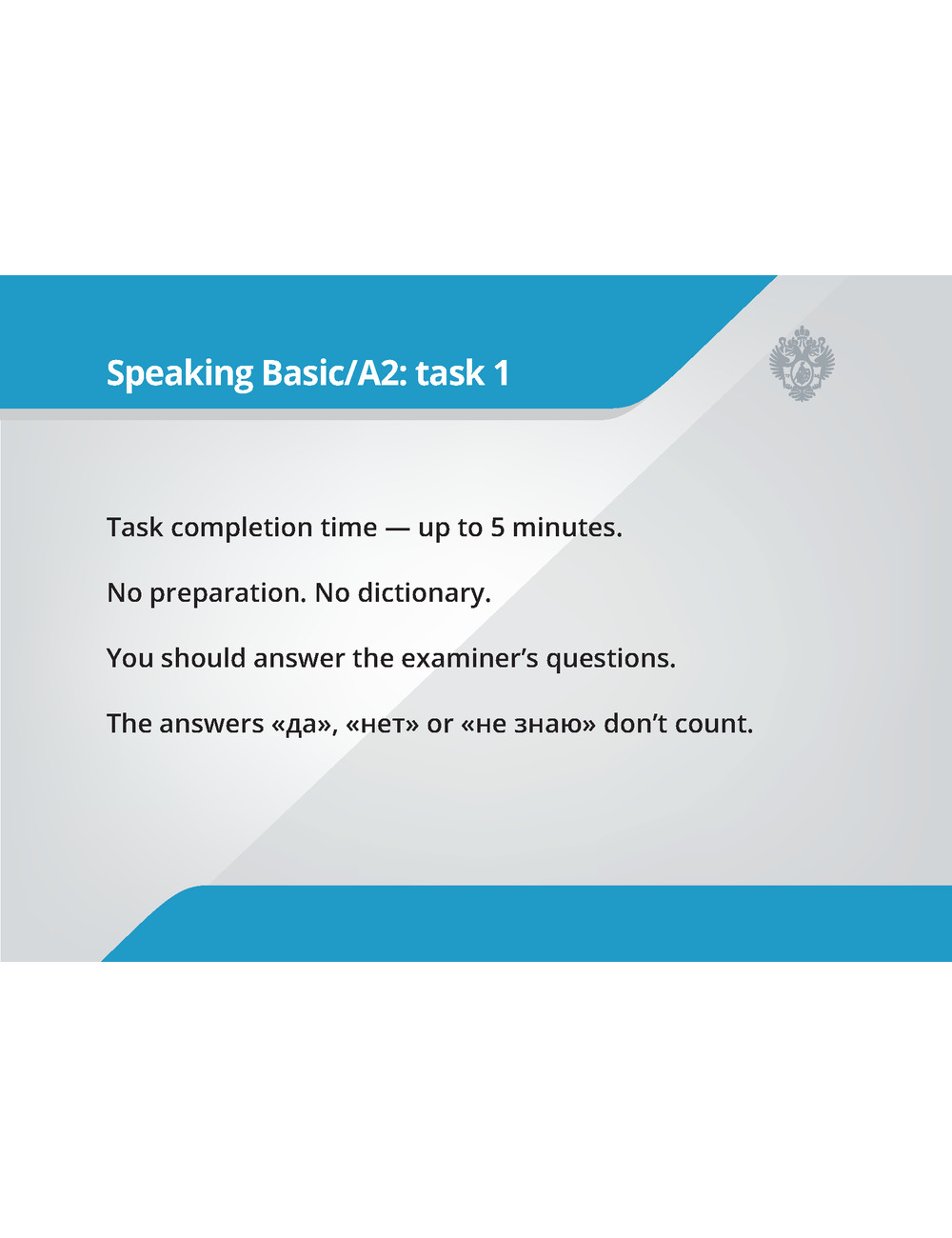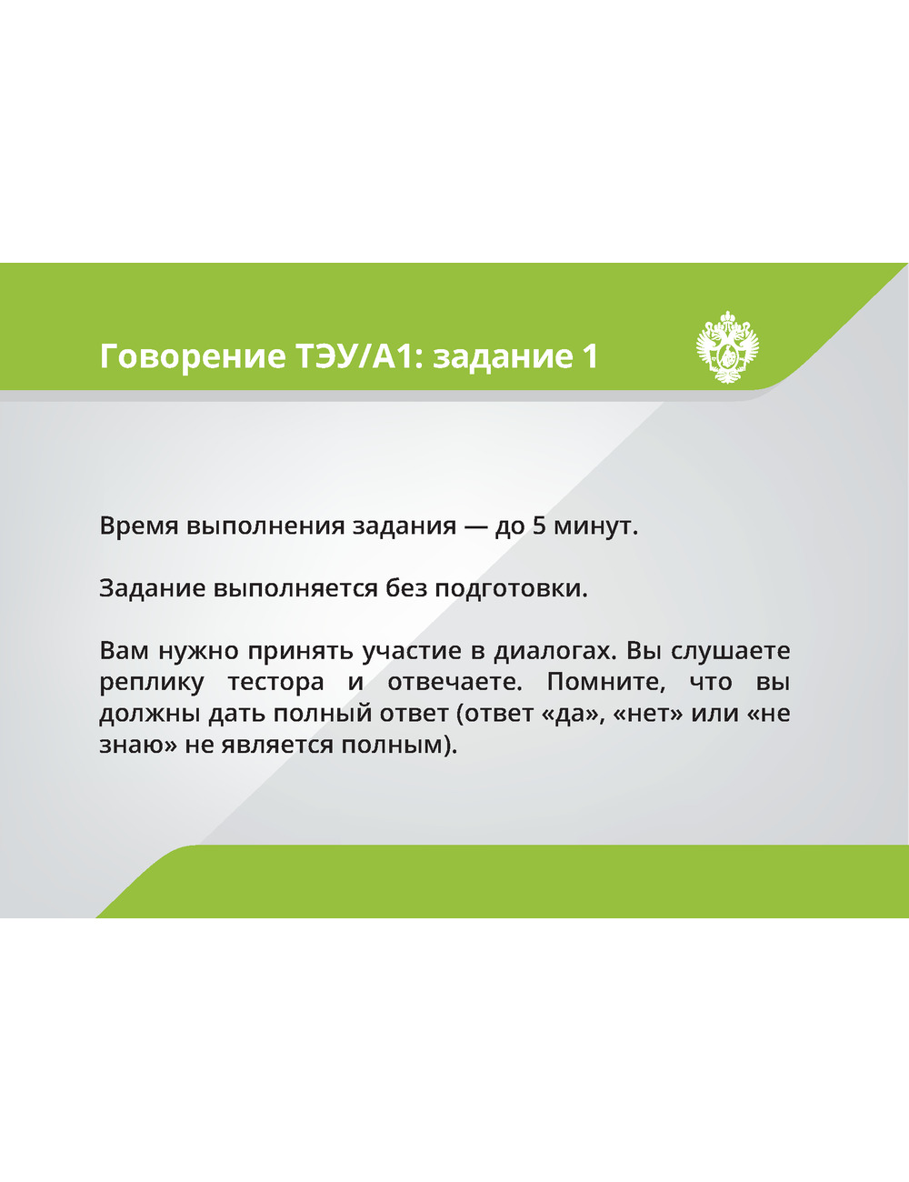 The cards are ready-made tasks of the «Speaking» subtest for levels A1, A2 and B1. There are 5 variants of each task for every level*. The set contains the tasks, the instructions for the tasks and the «Speaking» subtest description (time limit, rules for using a dictionary).