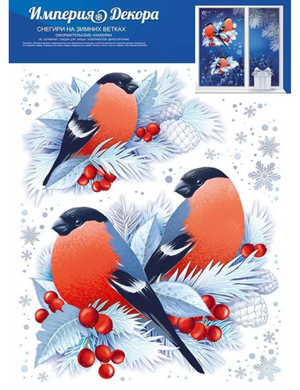 Наклейки с изображением ярких снегирей на пушистых ветках для оформления интерьера. Подходят для любых гладких поверхностей: дерево, металл, стекло, пластик, кафель, обои (кроме бумажных). Наклейки двусторонние, не оставляют следов — идеальны для окон.