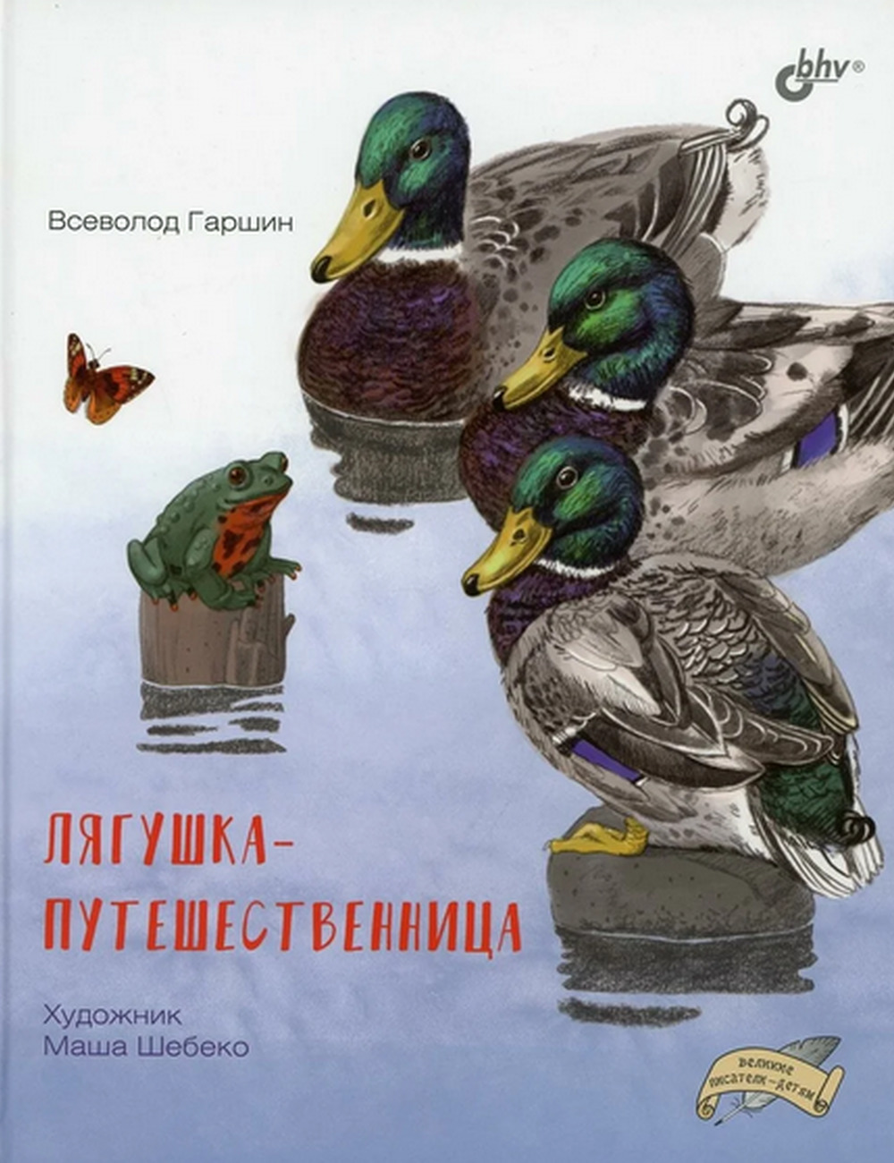 Сказка Всеволода Гаршина уже более ста лет считается одной из самых поучительных и веселых в русской литературе. История о лягушке , которая придумала способ путешествовать, но не смогла не похвастаться своей находчивостью , стала сюжетом мультфильмов и спектаклей и по праву считается классикой детского чтения. Благодаря удивительно точным иллюстрациям Маши Шебеко и словарику в конце книги маленькие и взрослые читатели узнают , кто такие цикада и ручейник, чем питаются водяные скорпионы , как узнать утку-крякву и многое другое.