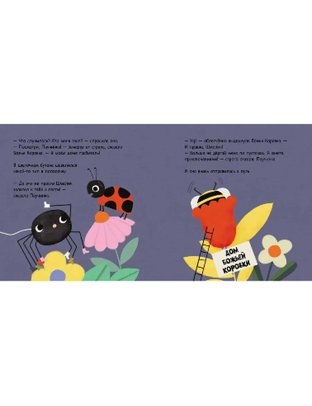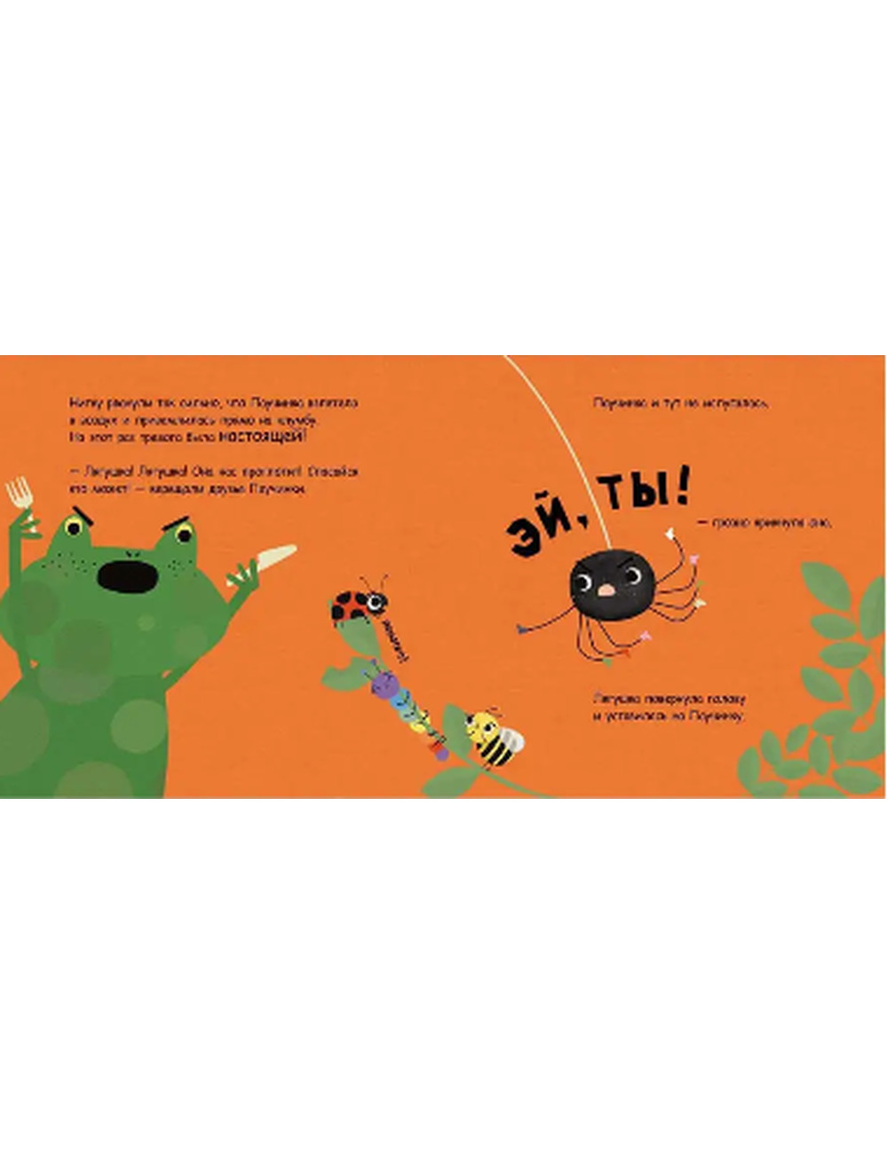 Паучинке наскучило сидеть на своей клумбе и она решает отправиться на поиски приключений. Друзья Паучинки - Гусеничка, Божья Коровка и Шмелик предупреждают ее об опасностях, которые таятся в Большом саду на каждом шагу. Но Паучинка не слушает их и смело идет вперед, навстречу приключениям! Однако друзья то и дело зовут ее на помощь, дергая за нитку-паутинку. И каждый раз тревога оказывается ложной. Какие же все они глупышки и трусишки! Ведь бояться-то некого! Или все-таки есть кого? Молодая британская писательница С. Марендаз и художница Карли Гледхилл рассказывают нам две истории: в первой мы воспринимаем события глазами Паучинки