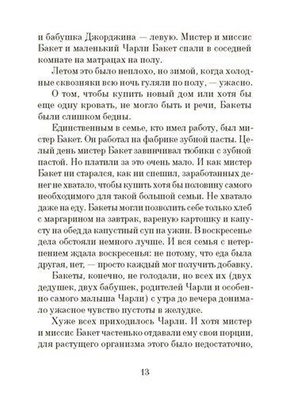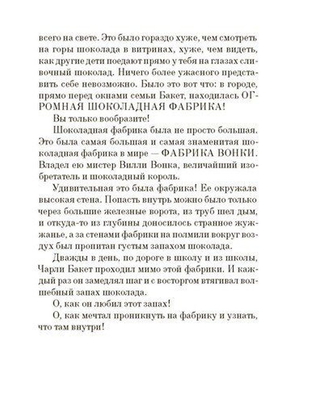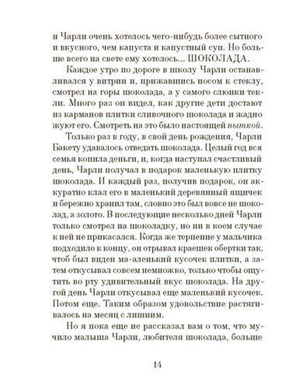 Маленький мальчик Чарли Бакет живет в большой и дружной, но очень бедной семье. Они не могут позволить себе даже самого необходимого. А Чарли очень-очень любит шоколад... Неподалеку от их дома работает таинственная шоколадная фабрика. Каждое утро по дороге в школу Чарли чувствует, что воздух пропитан сладким запахом шоколада, и останавливается перед воротами: двести видов шоколада, шоколадное мороженое, которое никогда не тает, зефир с запахом фиалок, карамельки, меняющие цвет, — разве не об этом мечтают все дети на свете?.. И вдруг у него появляется шанс попасть на фабрику в числе пяти счастливчиков, нашедших золотой билет... .Книга неоднократно выходила на разных языках и получила множество премий. «Чарли и шоколадная фабрика» — одна из самых любимых сказок ребят во всем мире!