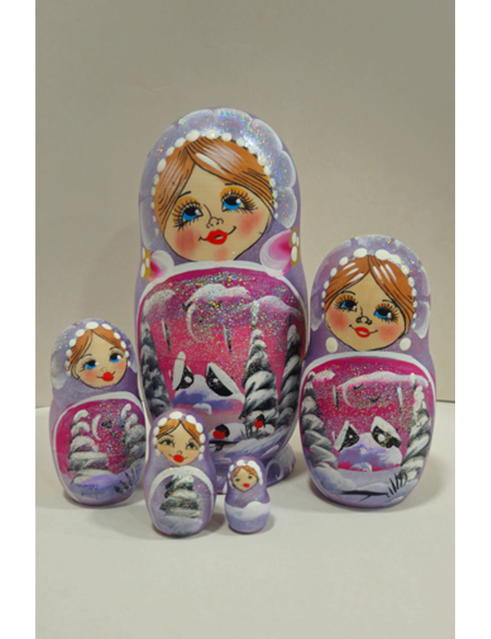 Небольшая пятиместная матрешка с зимними пейзажами. Одна из самых популярных среди сувенирной продукции.