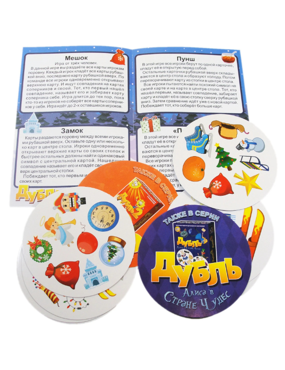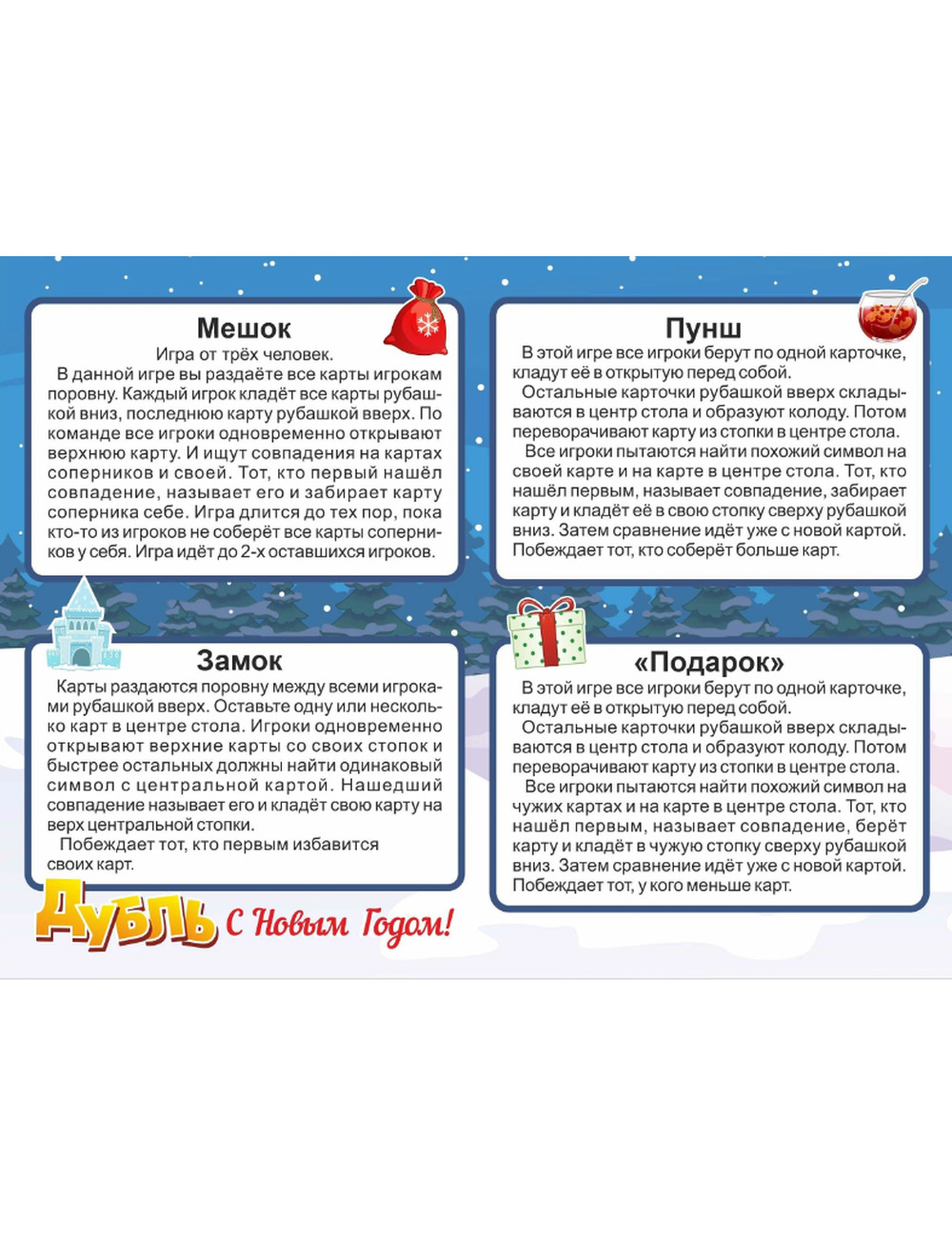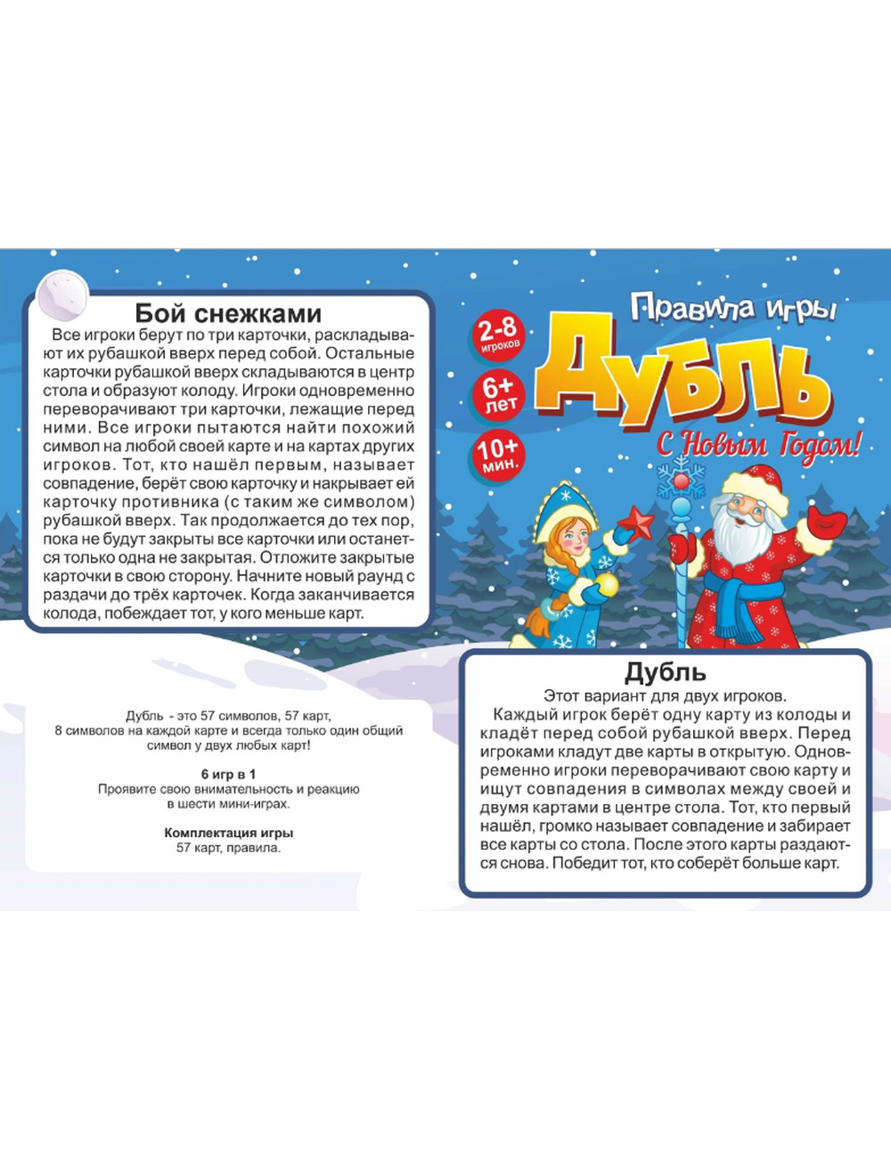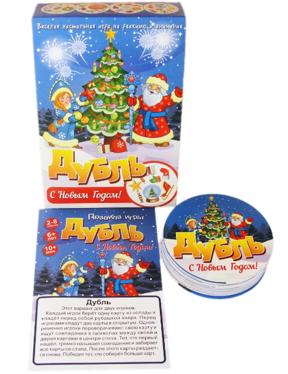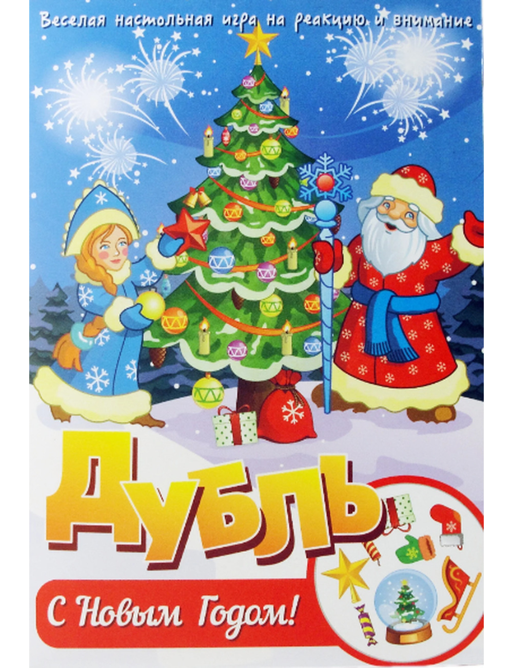 Дубль "С Новым годом!", это веселая интересная игра на скорость и внимание. На 57 картах расположены по 8 разных символов относящихся к тематике Нового Года. На любых двух картах всего один общий символ из 57. Найди их и назови раньше других игроков.