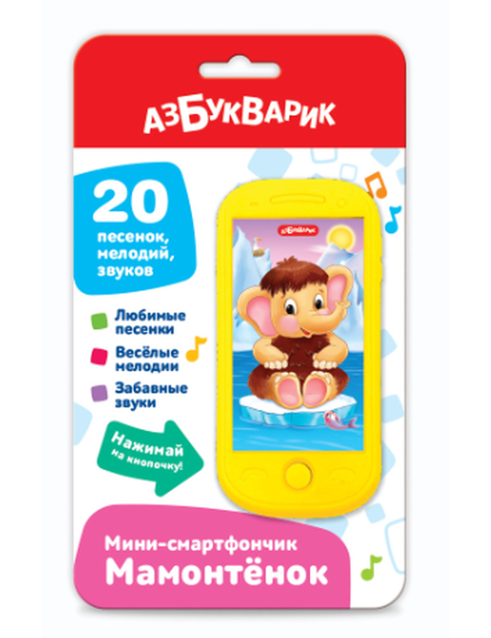 Компактный мини-смартфончик так удобно носить с собой! Он порадует малыша любимыми песенками («Песенка Мамонтёнка», «Друзья», «Джунгли», «Зачем слоникам хобот?», «Зверюшки», «Что такое праздник?») и мелодиями с забавными звуками («Кукарача», «Полька», «Мама-мамочка»). Нужно просто нажимать на кнопочку, слушать и подпевать! Всего в игрушке 20 песенок, мелодий, звуков.