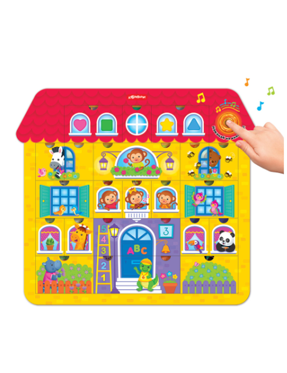 Собирать пазлы под музыку еще интереснее! При нажатии на кнопочку малыш послушает 5 веселых песенок («Наш весёлый шумный дом», «Давай играть и не скучать», «Бум-Бум», «Прятки», «Друзья»), забавные мелодии и звуки.