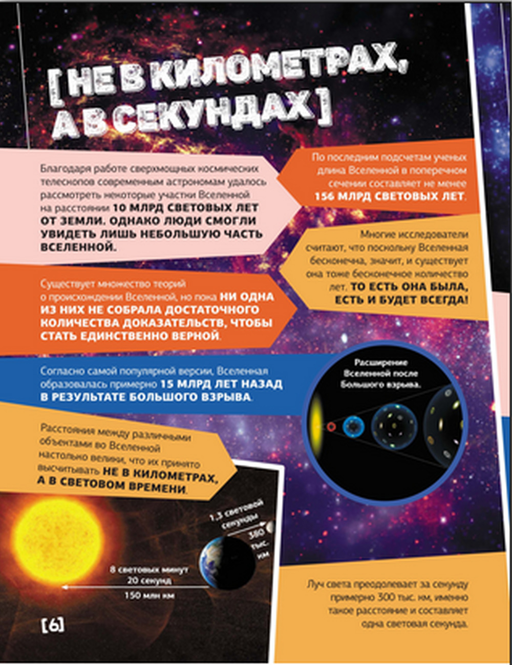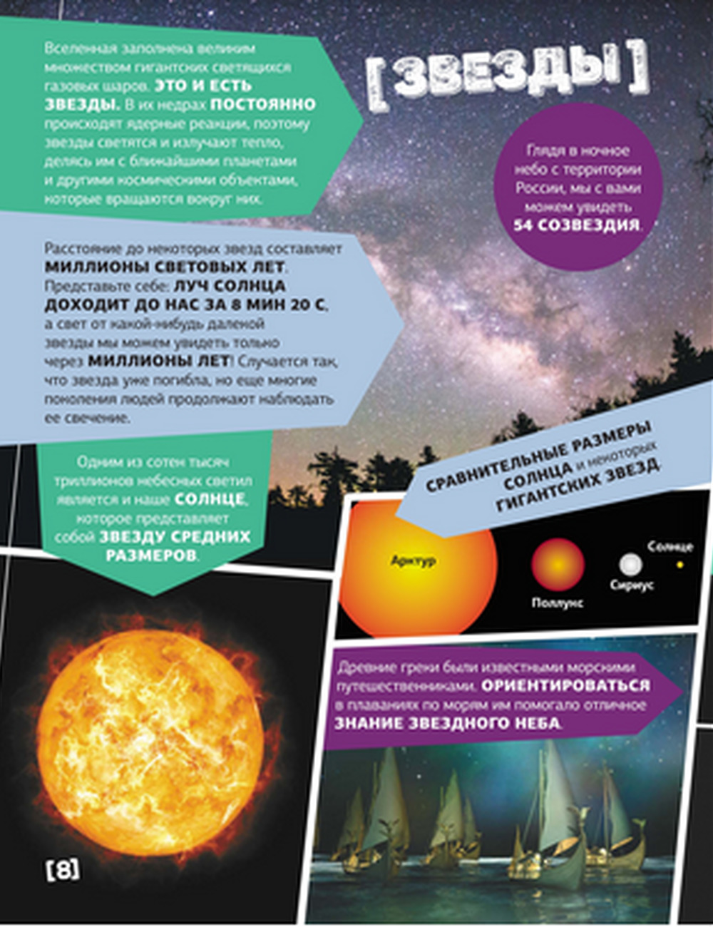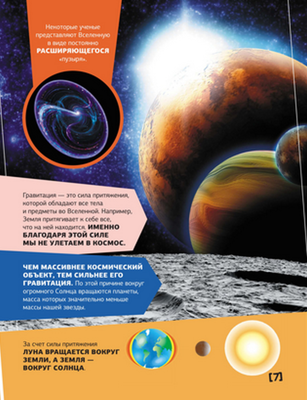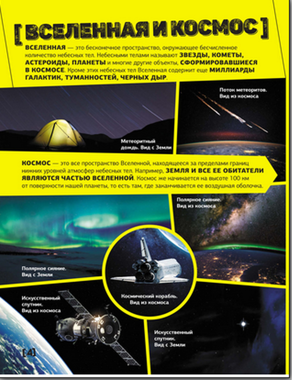 Эта энциклопедия знакомит детей с удивительным миром космоса, но делает это в несколько ином формате, чем другие издания. Здесь нет больших описательных статей и научной классификации — лишь короткие факты и уникальные фотографии нашей Галактики и Солнца, созвездий и туманностей, планет Солнечной системы и их спутников, астероидов и комет, космических аппаратов и орбитальных станций, луноходов и марсоходов. И несмотря на это, юный читатель получит полное представление о том или ином космическом объекте, ведь приведенная информация не только интересная, но и вполне познавательная, а фотоснимков так много, что далекие небесные тела и умные космические «машины» можно рассмотреть со всех ракурсов и в мельчайших подробностях. Таинственный и манящий мир космоса не перестает удивлять, и вы убедитесь в этом, когда прочитаете эту книгу.