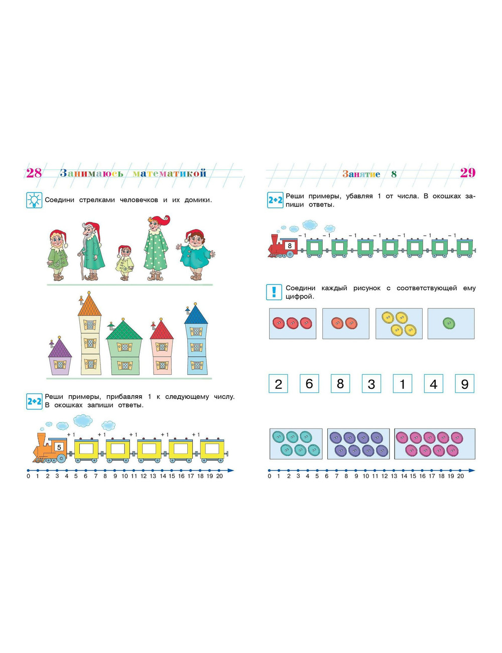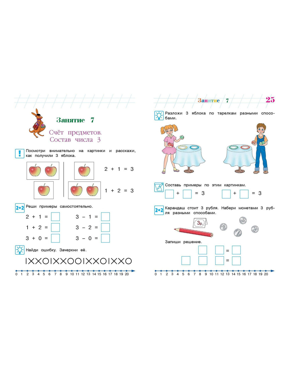 Выполняя интересные игровые задания, ребенок повторит состав числа, будет решать примеры и задачи на сложение и вычитание с помощью числовой прямой в пределах 20, познакомится с четными и нечетными числами, углами, отрезками, плоскими и объемными фигурами, научится считать десятками, потренируется в определении времени по часам.