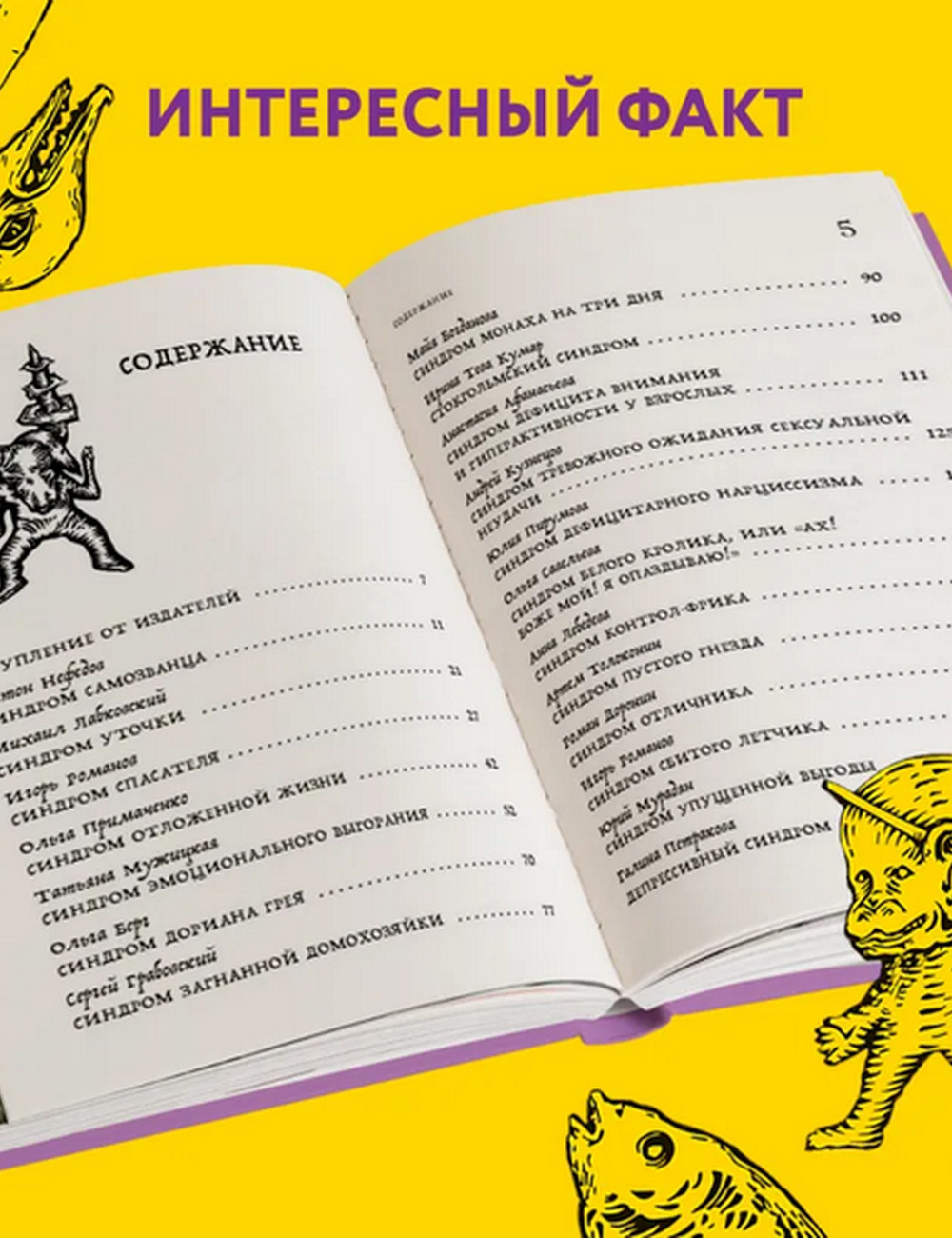В него вошли статьи как про всем известные синдромы, вроде самозванца, отличника и спасателя, так и про те, о которых редко можно прочитать в открытых источниках. Например, о синдроме сбитого летчика, пустого гнезда, мачехи принцессы или уточки. Авторы статей — популярные российские психологи: Татьяна Мужицкая, Ольга Примаченко, Михаил Лабковский, Артем Толоконин, Юлия Пирумова, Ольга Берг, Игорь Романов и многие другие. Каждый из них не только описывает проявления того или иного синдрома, но и дает лаконичные рекомендации, как ослабить его влияние на свою жизнь. Или даже научиться извлекать пользу.