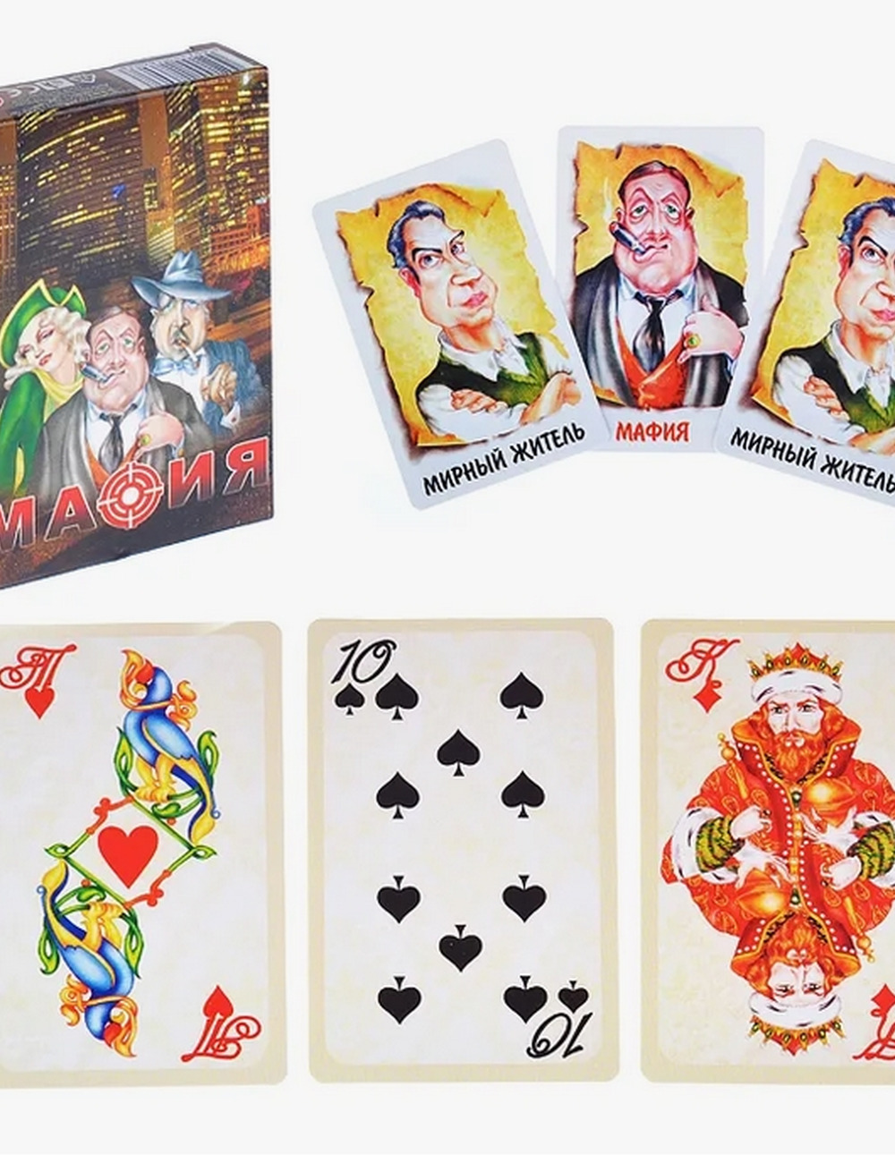 В наборе 20 карточек : "Ведущий" - 1 шт., "Мирный житель - 12 шт., "Мафия" - 3 шт., "Комиссар" - 1 шт., "Врач" - 1 шт. "Любовница" - 1 шт., "Маньяк" - 1 шт.