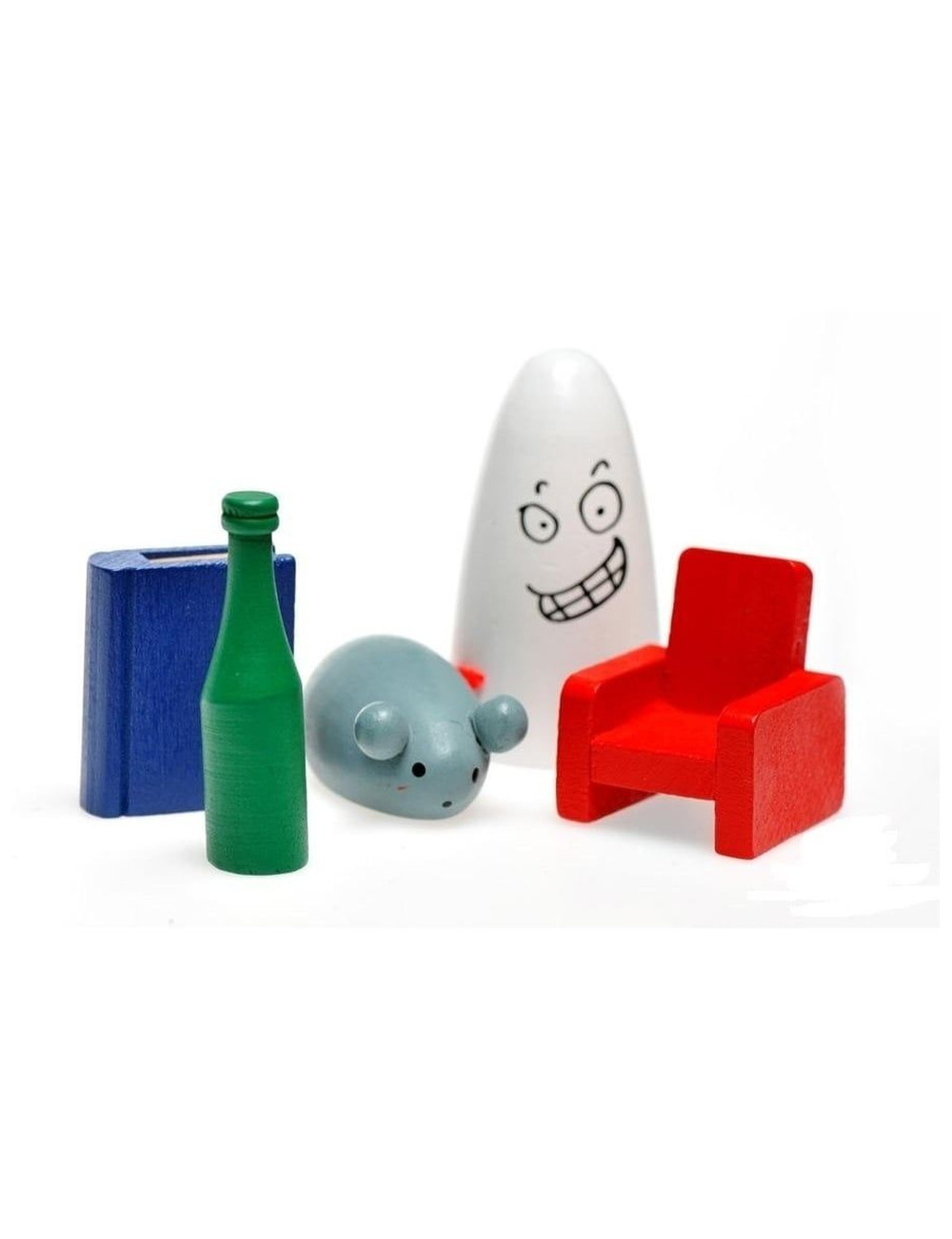 В комплект настольной игры Барабашка (Geistesblitz) входит 5 деревянных фигурок (привидение, кресло, книга, бутылка и мышь), 60 карт.