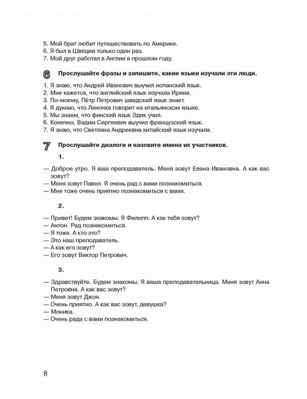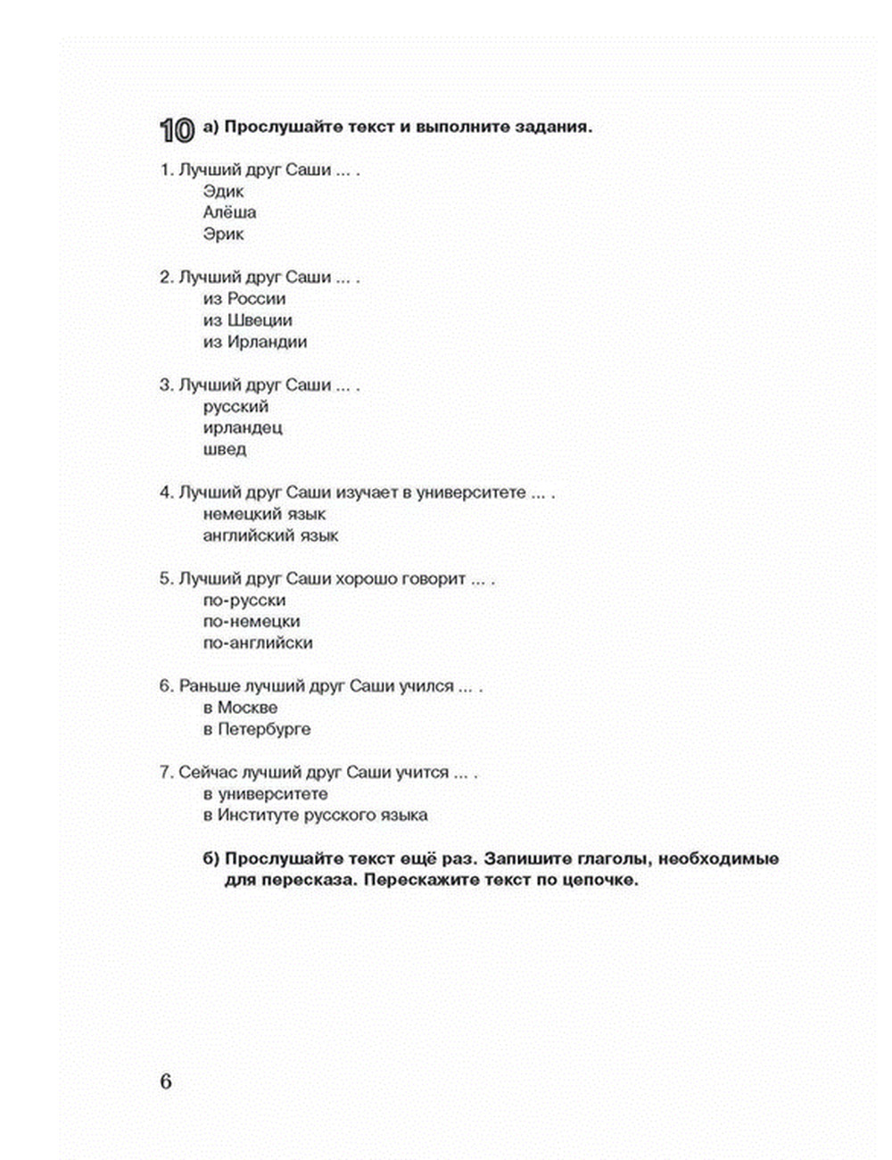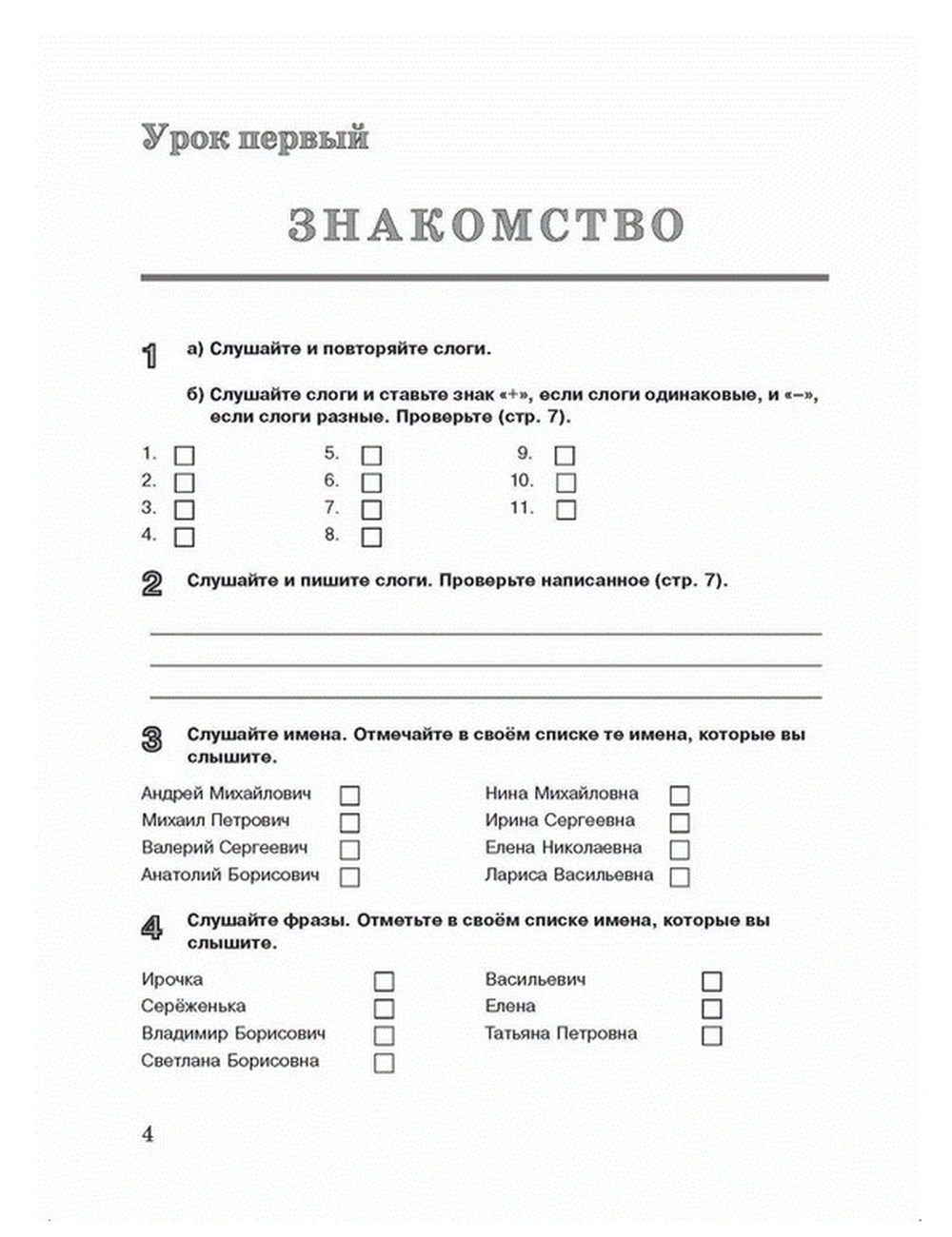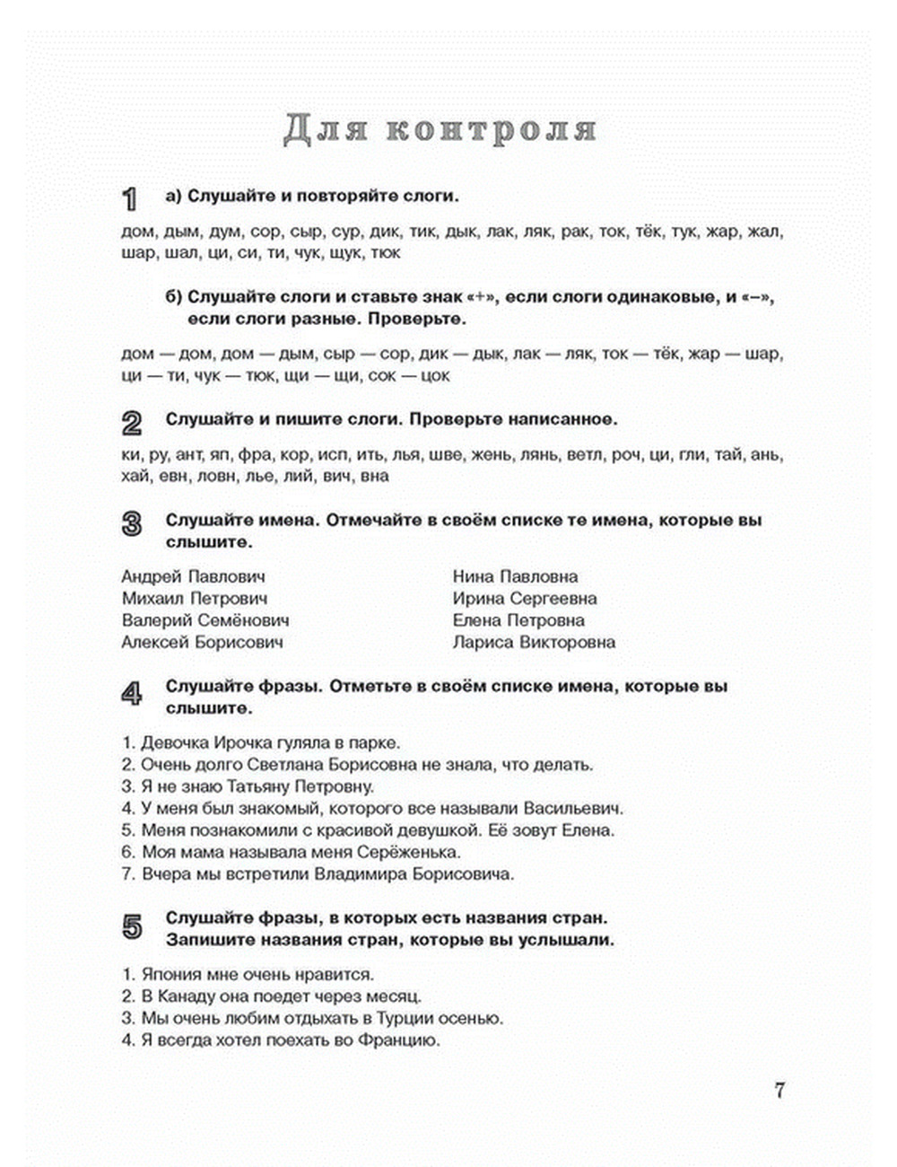 Цель пособия — формирование и развитие умений восприятия на слух русской разговорной речи, ускорение языковой и речевой адаптации, расширение умений учащихся в области письма и говорения, подготовка к сдаче Государственного теста в объеме «Программы по русскому языку как иностранному». Уроки пособия состоят из двух частей: упражнения для учащихся и контрольные материалы. Такое построение дает возможность использовать это пособие как на уроках русского языка под руководством преподавателя, так и для самостоятельной работы. Структура урока такова: от фонемы — к слогу, от слога — к слову, от слова — к словосочетанию, от словосочетания — к предложению, от предложения — к тексту.