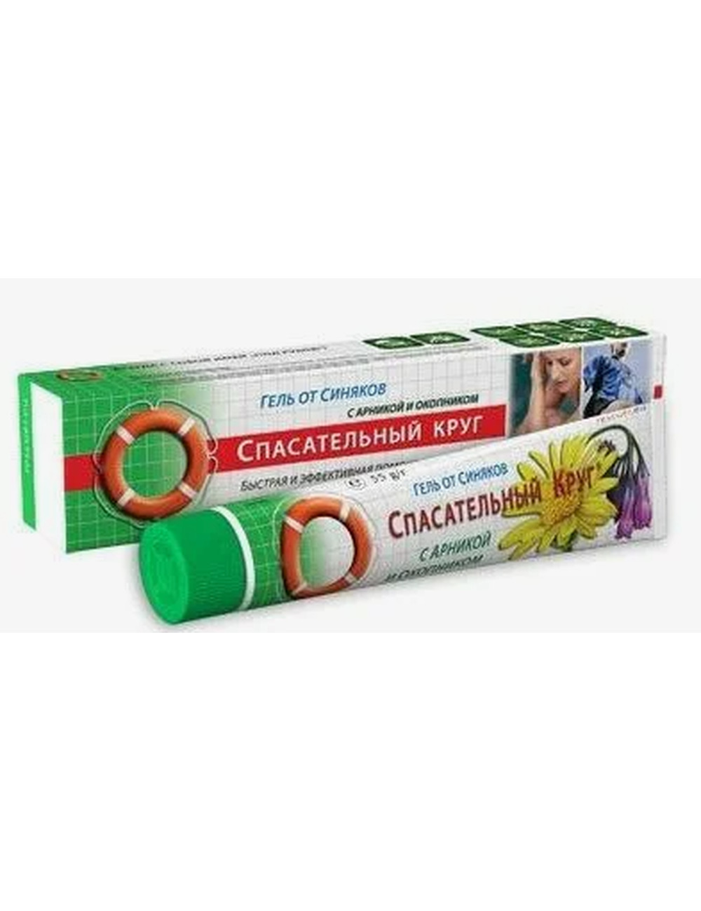СПАСАТЕЛЬНЫЙ КРУГ - ГЕЛЬ ОТ УШИБОВ И СИНЯКОВ С АРНИКОЙ И ОКОПНИКОМ 50гр. Гель рекомендован при появлении синяков и может применяться на коже различных участков тела после травм, ушибов и растяжений. Благодаря своей высокой биологической активности, ингредиенты препарата способствуют активизации местного кровообращения, проявляют рассасывающее и противоотечное действие; помогают быстро успокоить кожу в местах укусов комаров, ожогов медуз и крапивы. Препарат стабилен при высоких и низких температурах. Компактен, удобен в применении, не требует специальных условий хранения и полностью безопасен. Быстро впитывается, не оставляя на коже жирных пятен, после чего на кожу может наноситься декоративная косметика. Препарат не обладает маскирующими свойствами. Активные ингредиенты: природные экстракты окопника, конского каштана, арники и календулы, ментол.
