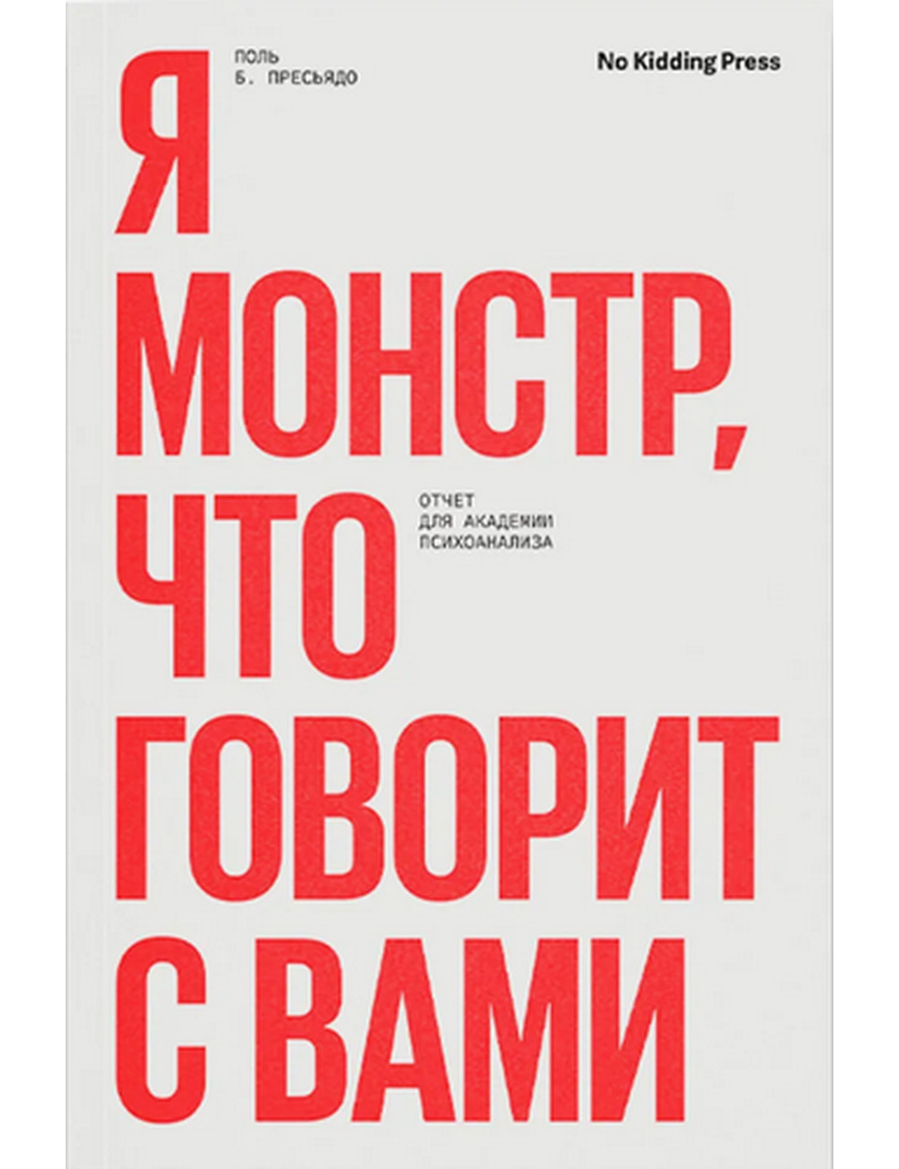 Семнадцатого ноября 2019 года Поль Б. Пресьядо выступает в Париже перед 3500 психоаналитиками в рамках Международных дней Школы фрейдова дела. Представая перед людьми, чья профессия ставит ему диагноз «психическое заболевание» и «гендерная дисфория», Пресьядо в своей речи отталкивается от «Отчета для академии» Франца Кафки. В этом произведении обезьяна, выучив человеческий язык, говорит с академией высших научных авторитетов. Далекая от эмансипации говорящая обезьяна Кафки объясняет, что изучение человеческого языка стало для нее лишь переходом из одной клетки в другую: от железных прутьев к человеческой субъектности.