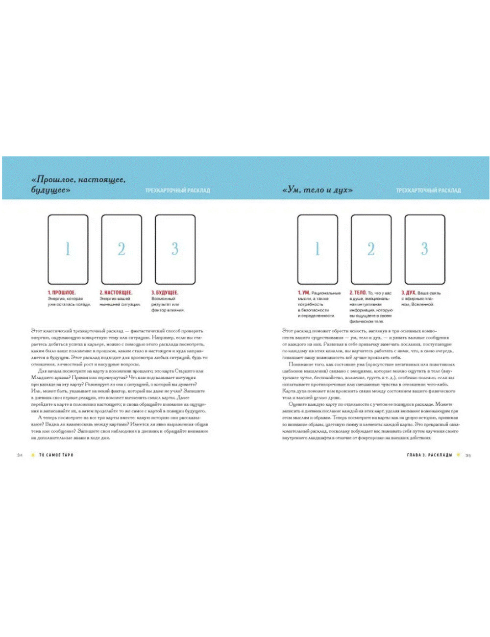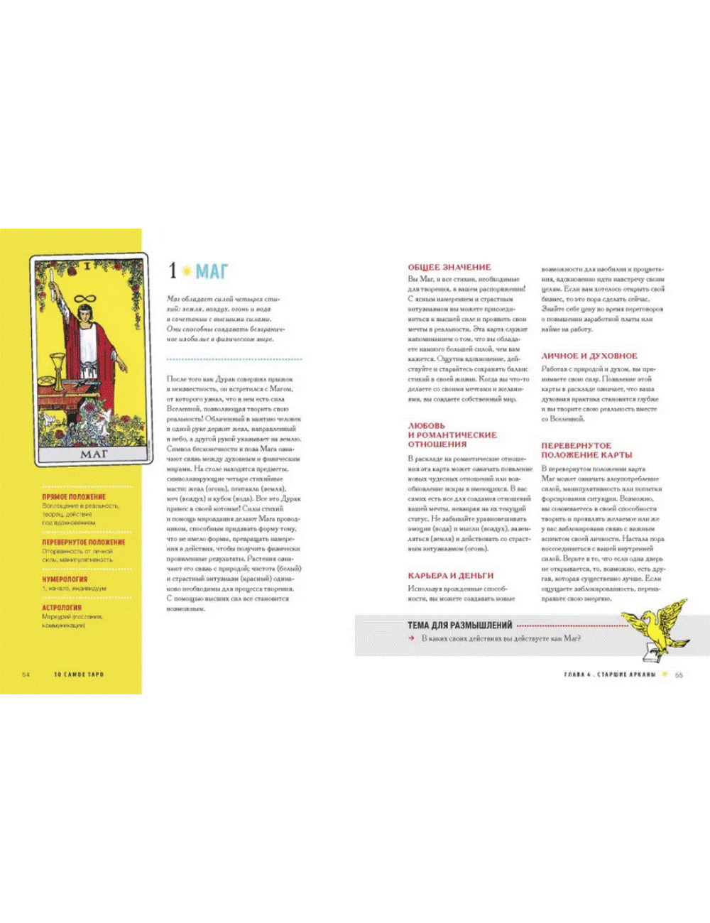 Книга начинается с описания, что такое Таро. В ней рассказывается о взаимоотношениях со своей колодой, о том, как интерпретировать расклады (упражнения на ассоциации). Также здесь вы найдете описание каждой карты и ее значения — от старших карт к младшим.