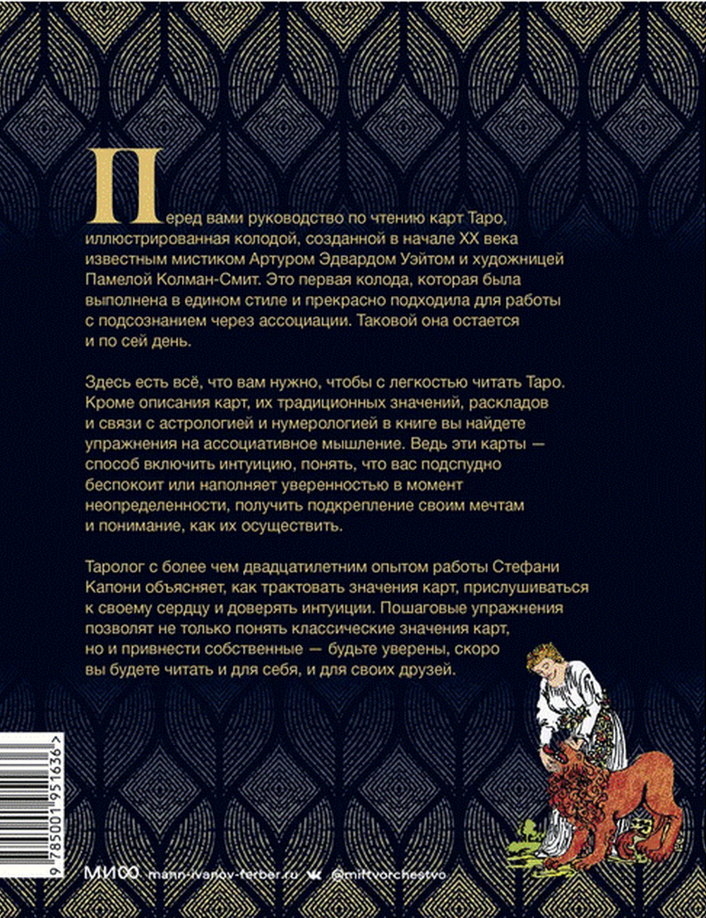 Стефани Капони, эксперт с более чем двадцатилетним опытом работы, объясняет, как трактовать значения карт, учит прислушиваться к своему сердцу и развивать интуицию. Пошаговые упражнения на примере известной колоды Уэйта позволят не только понять классические значения, но и привнести собственные — будьте уверены, скоро вы будете читать и для себя, и даже для своих друзей.