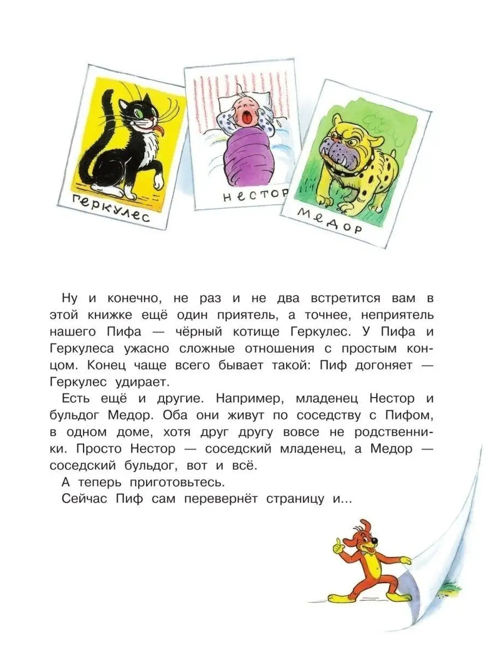 Пёс Пиф появился во Франции в 1945 году. Его придумал художник и карикатурист Хосе Кабреро Арналь. Забавный Пиф стал главным персонажем комиксов, которые печатались в газетах и журналах. Вскоре истории про Пифа так полюбились французским читателям, что приобрели новый формат: их стали печатать отдельными книжками, снимать по ним мультфильмы, появились и театральные постановки.Сегодня истории про остроумного и изобретательного Пифа и его друзей дядю Цезаря, тётю Агату, малыша Дуду и кота Геркулеса для российских детей написал Григорий Бенционович Остер.Иллюстрации В. Сутеева.Для дошкольного возраста.