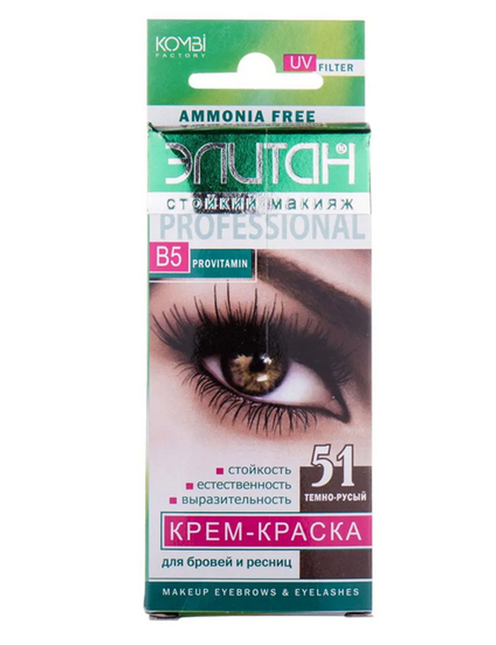 овая формула крем-краски для бровей и ресниц без аммиака "Стойкий макияж" Элитан обеспечивает стойкий макияж на длительное время даже при контактах с водой. Витамин В5, входящий в состав продукта, защищает брови и ресницы от ломкости и выпадения, делает их здоровыми и блестящими.
