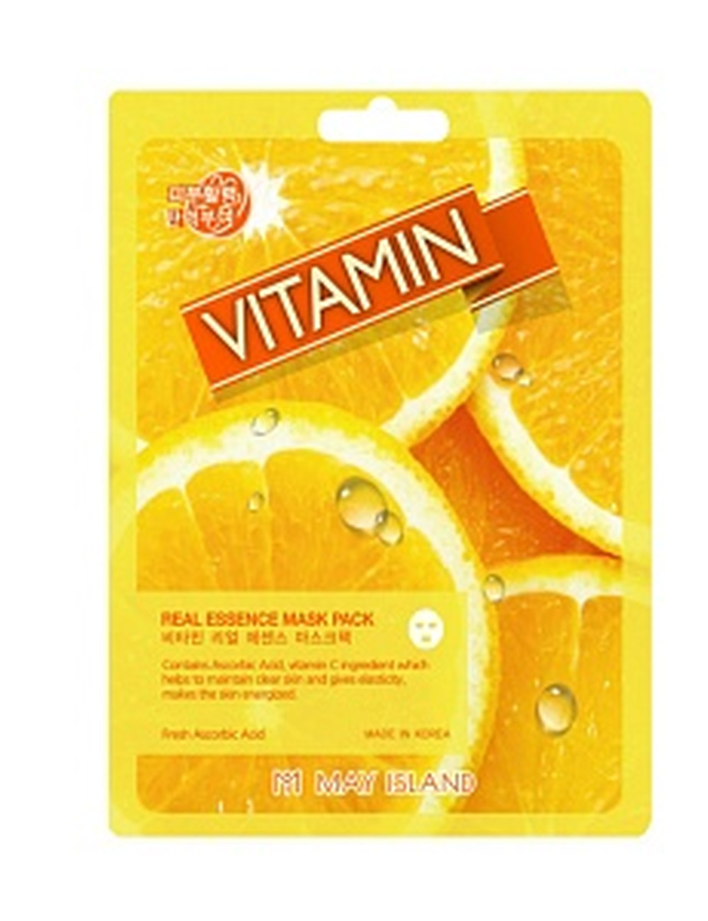 Тканевая маска для лица с витамином May Island Real Essence Vitamin Mask Pack 25 мл осветляет, успокаивает и придает упругость коже, повышает регенеративную способность клеток и скрывает видимость морщин.