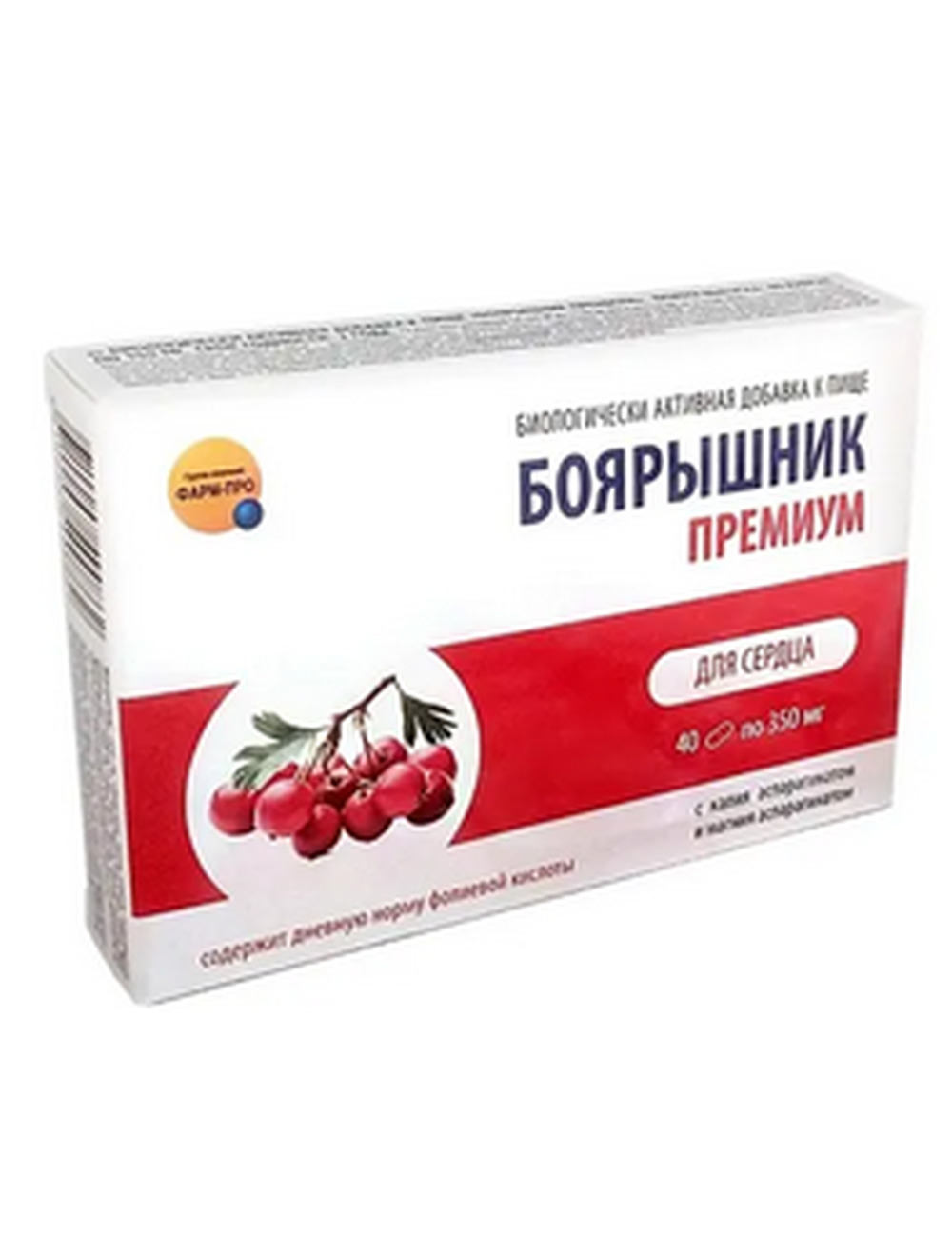 Боярышник премиум фарм-про 40 шт. капсулы - это биологически активная добавка к пище, содержащая экстракт цветков и плодов боярышника, калия аспарагинат, магния аспарагинат, фолиевую кислоту.«Боярышник Премиум» - растительный комплекс, направленный на улучшение питания и укрепление сердечной мышцы. Состав препарата построен по принципу синергизма: базовые компоненты - цветки, плоды, экстракты боярышника усиливаются укрепляющими свойствами магния и калия. Боярышник Premium Farm Pro идеально подходит для людей, страдающих сердечно-сосудистыми заболеваниями, а также для тех, кто хочет предотвратить их возникновение. Принимать взрослым по 2 капсулы 2 раза в день во время еды. Продолжительность приема 1 месяц.