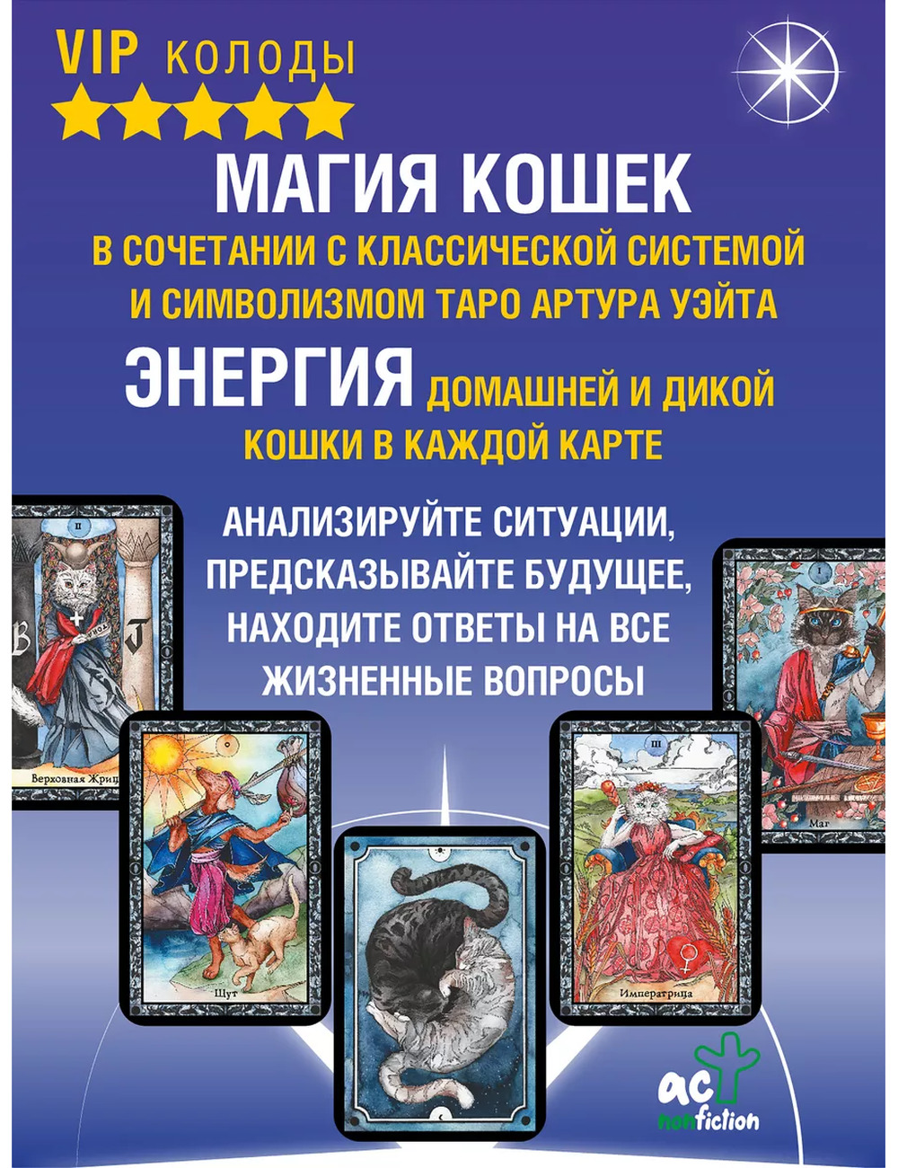 Таро "Колдовских кошек" раскрывает перед гадающим магическую природу этих прекрасных созданий как носителей мудрости, которым открыты тайны сотворения и устройства мира. Это потрясающая колода, где философия Таро сочетается с красотой и грацией кошек. На каждой карте представлены захватывающие дух иллюстрации, в основе которых лежат идеи Великого Мастера Таро — Артура Уэйта.