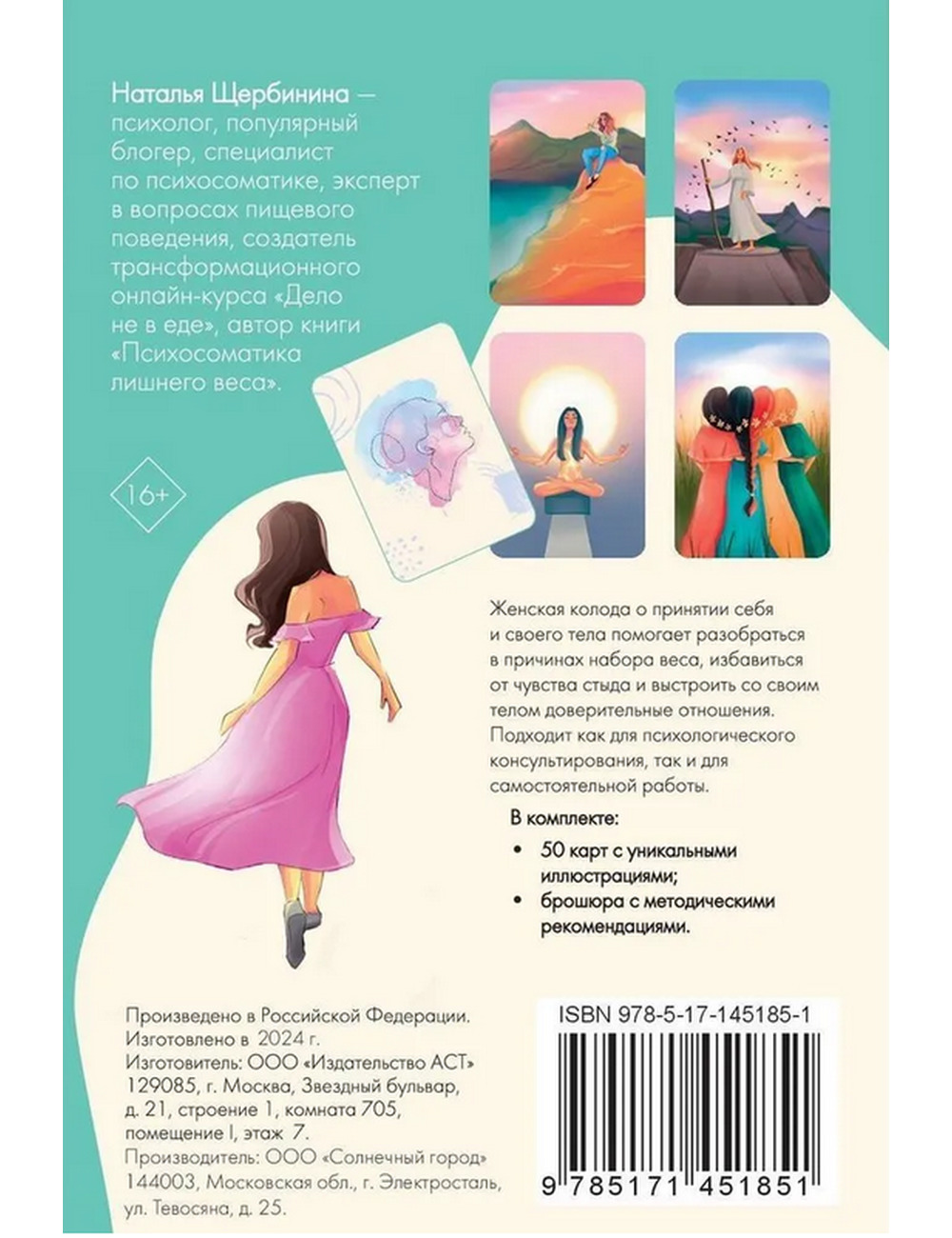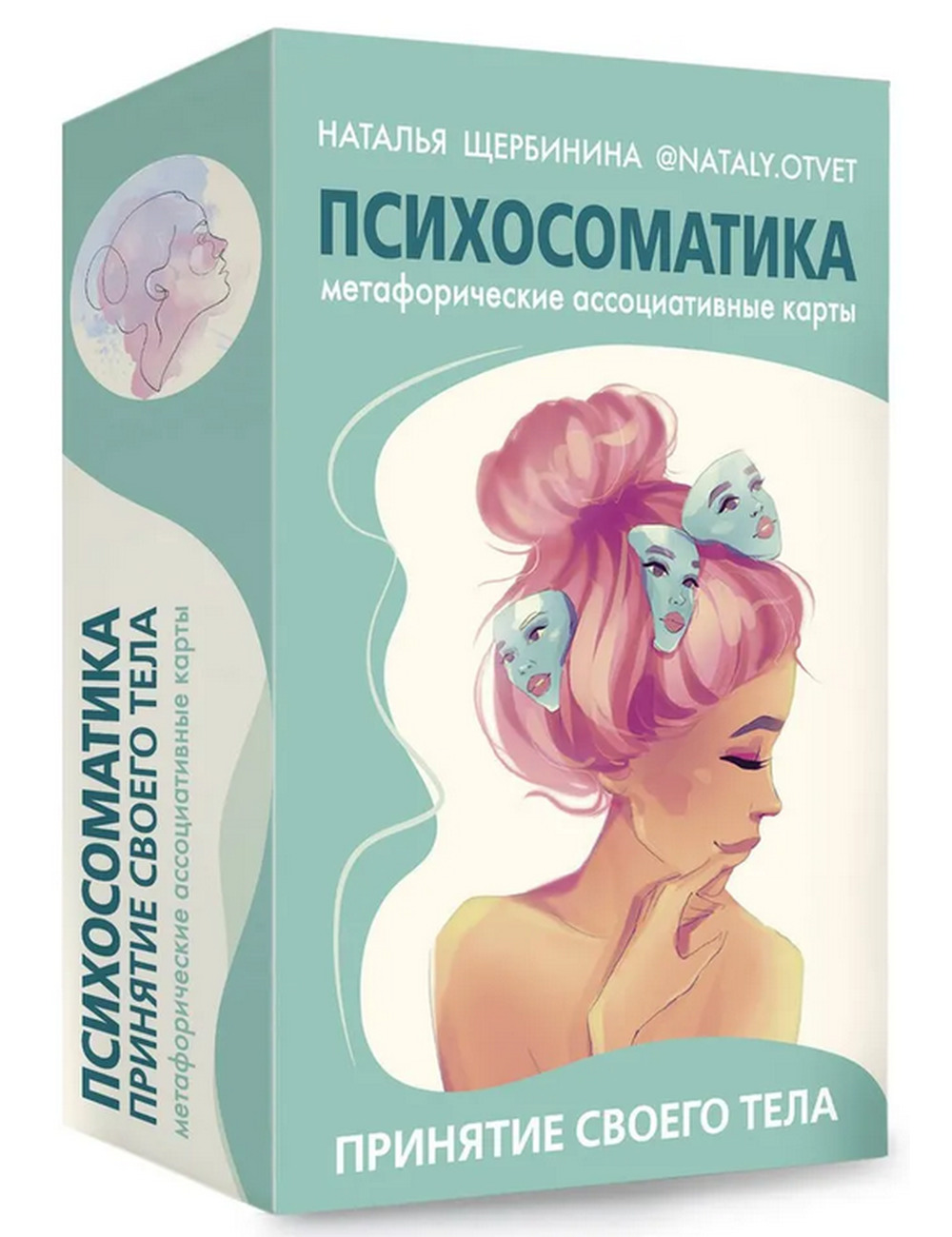 Метафорические ассоциативные карты «Психосоматика. Принятие своего тела» — авторская женская колода для работы с первопричинами лишнего веса и проблемами пищевого поведения. В каждой из 50 карт зашифрован определенный смысл, послание автора, дешифрующее и интерпретирующее переживания и страхи, чувства и эмоциональные состояния реальных женщин, столкнувшихся с проблемой разрыва связи с собственным телом. Колода Натальи Щербининой подходит как для психологического консультирования, так и для самостоятельной работы.