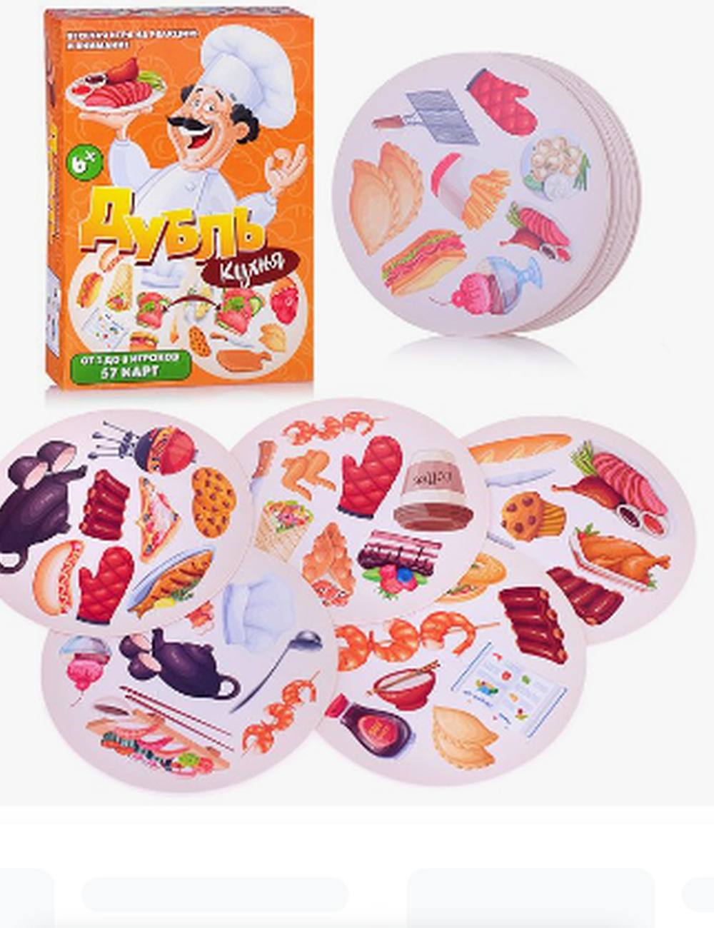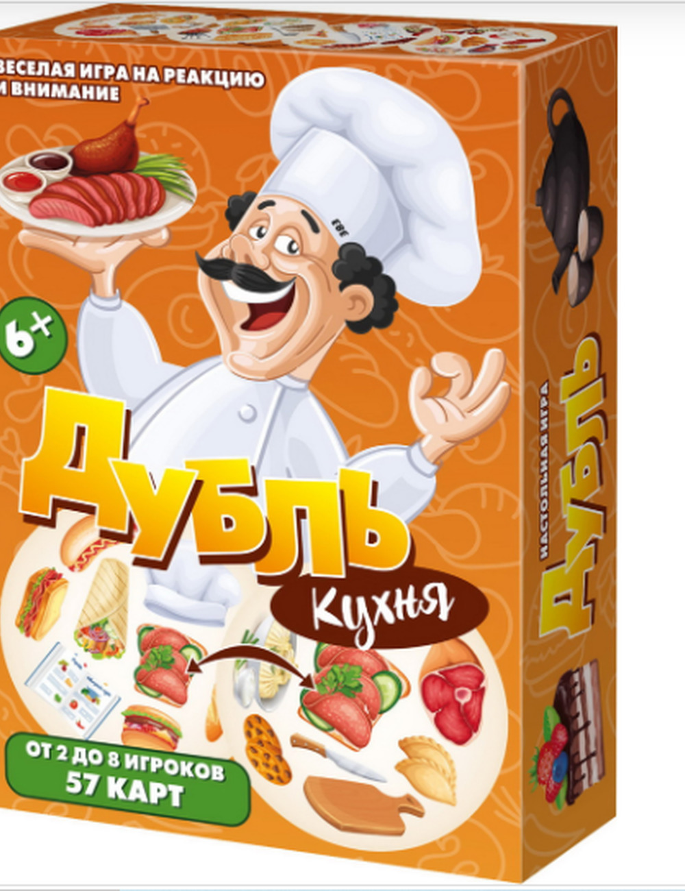 Настольная игра Дубль "Кухня” - это динамичная игра на реакцию и внимательность, которая перенесет вас в мир кулинарии. На всех карточках изображены предметы кухонной утвари, продуктов и блюд.