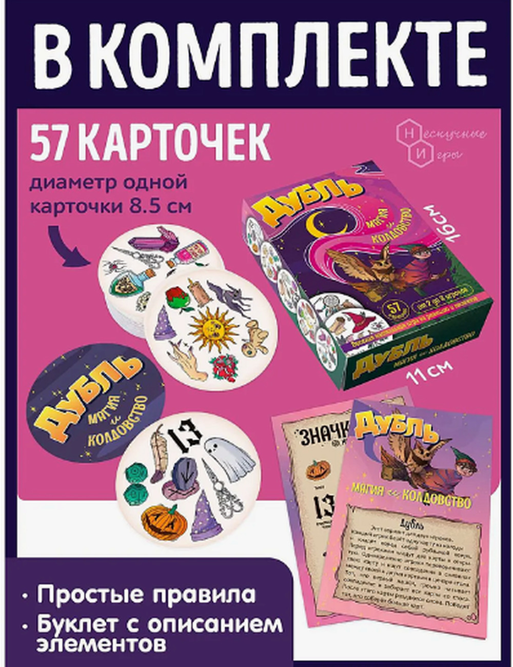 Настольная игра Дубль "Магия и Колдовство” - это динамичная игра на реакцию и внимательность, которая перенесет вас в мир волшебства и магии! В этой игре вам предстоит стать настоящими чародеями и колдунами, соревнуясь в быстроте реакции и скорости мышления. Состоит из 6 мини-игр в одной коробочке. Набор включает в себя 57 ярких и красочных карт из плотного картона. Каждая карточка уникальна и содержит 8 символов на каждой карте и всегда только один общий символ у двух любых карт. Главная цель игры - угадать как можно больше карт, опередив соперников. Дубль способствует развитию реакции, внимательности и скорости мышления, а также позволяет отлично провести время в кругу друзей или семьи. Настольная игра Дубль "Магия и колдовство" станет отличным развлечением для детей и взрослых, которые любят волшебные истории и хотят окунуться в мир магических приключений.