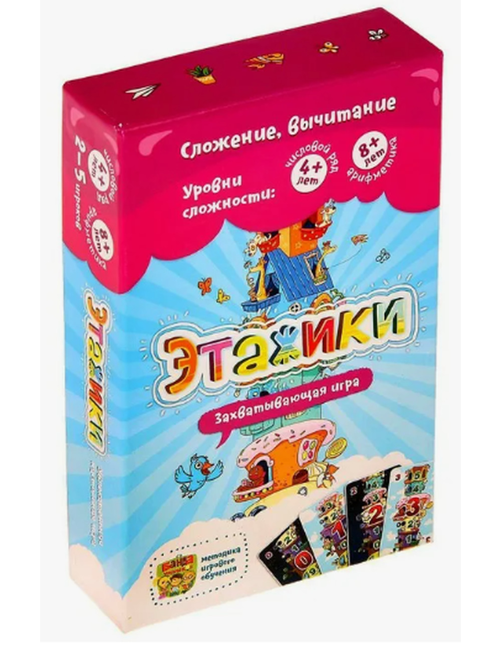 Учим цифры, устный счет, числовой ряд, сложение и вычитание. Красочная настольная игра "Этажики" позволяет быстро разобраться с числовым рядом и порядковым счетом, помогает освоить простые математические операции и понять, что такое переход через десяток (что не так просто дается детям). Яркие карты и обаятельные персонажи в этом помогут! 2-5 игроков, возраст: 4+ лет, 8+. Игра тренирует порядковый счет, помогает постепенно освоить простейшие арифметические операции, понять, что такое переход через десяток. Нужно зарабатывать звезды, перемещаясь вверх-вниз по этажам. Если получилось выложить все карты этажей с руки в правильной комбинации - звезда твоя! В комплекте: 60 прямоугольных карт этажей, 34 прямоугольные карты с шарами, 14 призовых квадратных карт, Иллюстрированные правила.