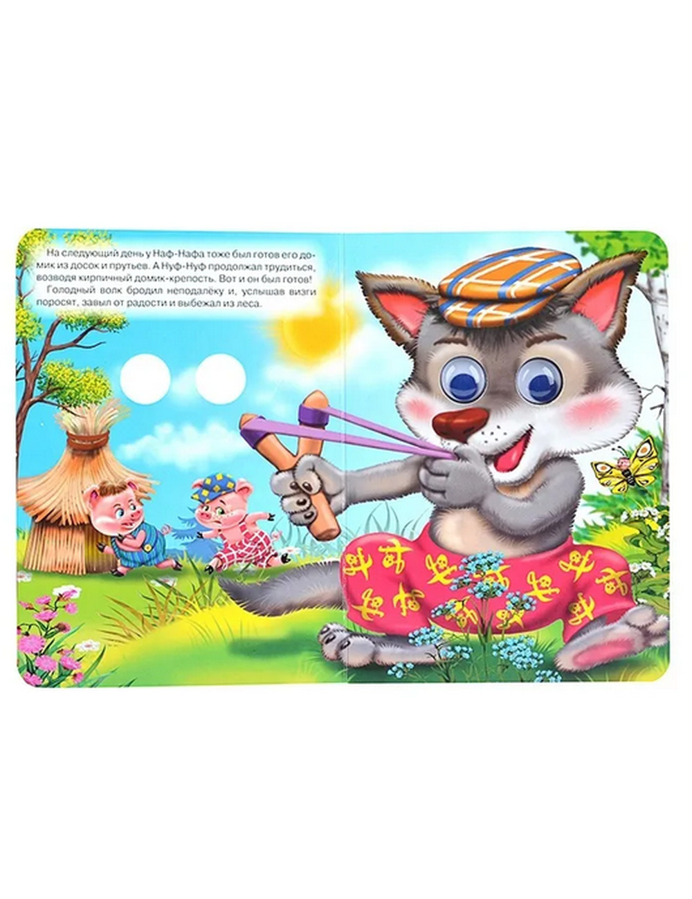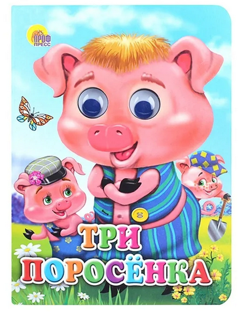 Книжка с глазками «Три поросенка» от издательства «Проф-Пресс» предназначена для малышей. Книжка-игрушка содержит в себе известную сказку про трех братьев поросят. На каждой твердой странице книжки вырезаны отверстия, поэтому герои сказки «смотрят» пластиковыми глазками с подвижными зрачками. Глазки прикреплены к последней странице и служат для оживления героев. Это делает книжку игрушкой и тем самым привлекает малыша к чтению.