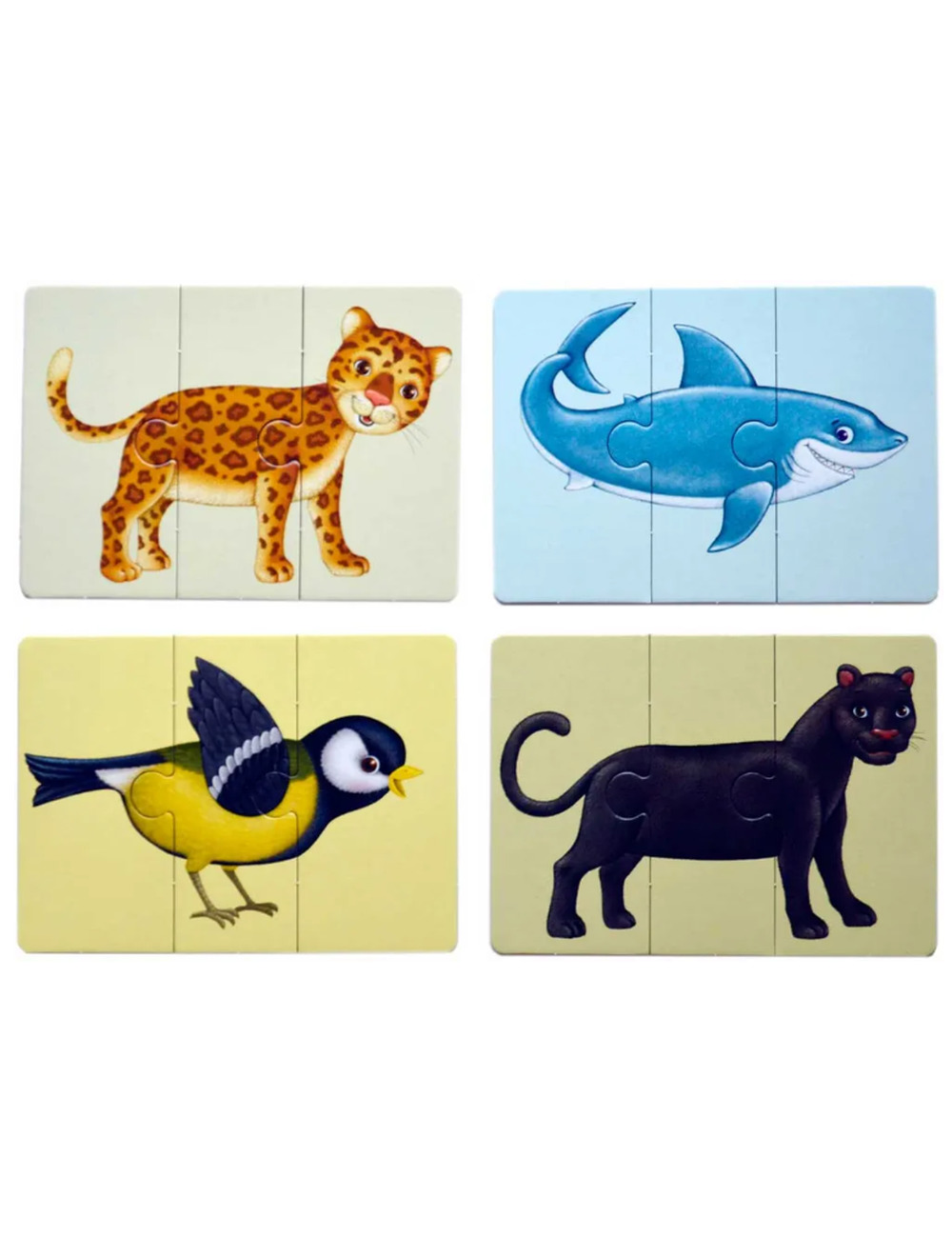 На оборотной стороне картинки вы соберете три изображения, ассоциативно связанных друг с другом. Все карточки-пазлы идеально стыкуются друг с другом, поэтому из них можно составлять смешных несуществующих животных!