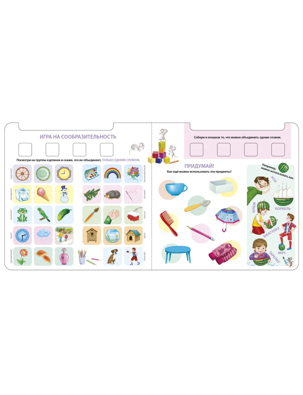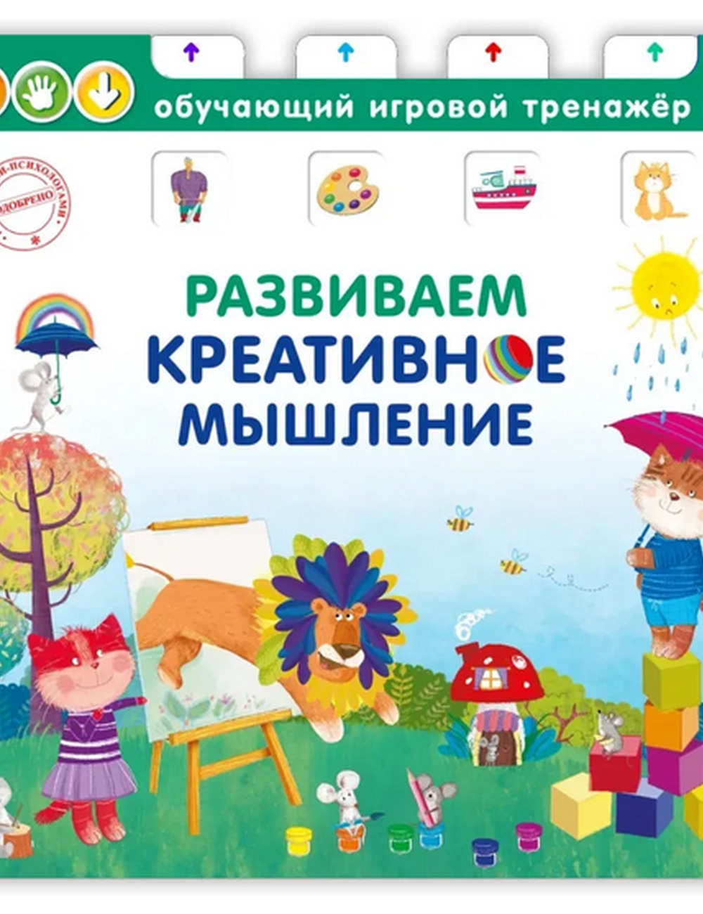Обучающий игровой тренажёр "Развиваем креативное мышление" содержит целый комплекс игр для развития креативного мышления у детей 3-7 лет. С помощью пособия ребенок научится придумывать загадки и метафоры, составлять тематические и ассоциативные цепочки, а также в игровой форме потренирует зрительную и словесно-логическую память, разовьет аналитические способности отработает навыки аргументации.