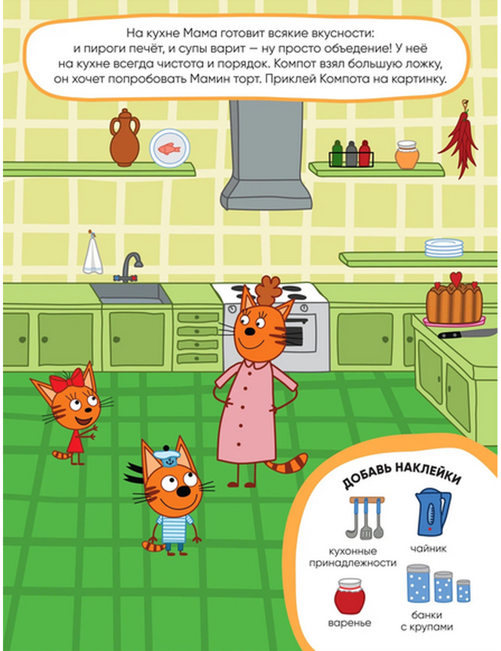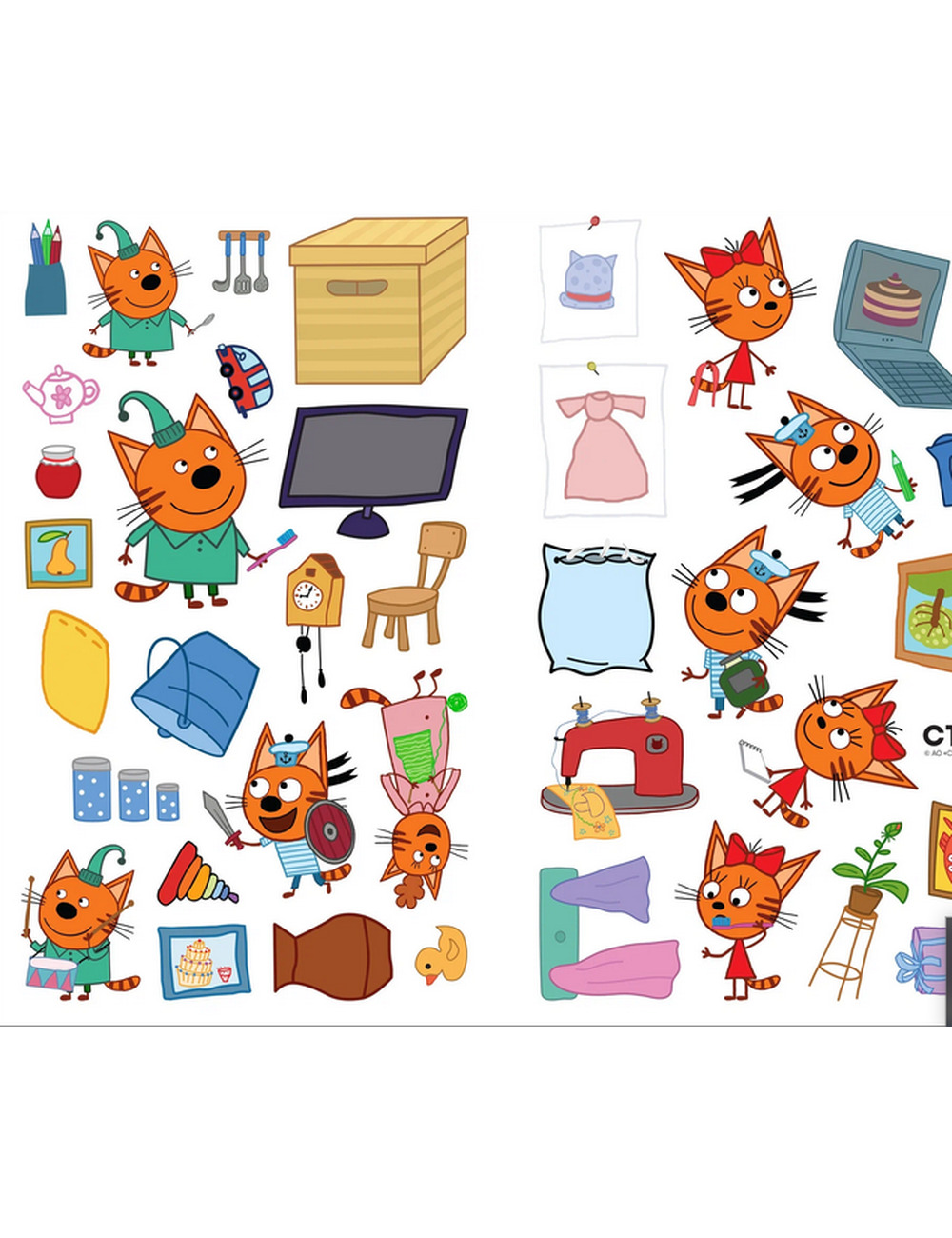 Миу-миу-миу! А ваш ребенок любит мультсериал «Три кота»? Тогда ему обязательно понравится эта красочная книжка с многоразовыми наклейками.
